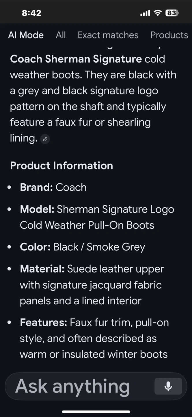 Coach Sherman Signature cold weather boots in black and smoke grey. They feature a signature logo pattern with a faux fur or shearling lining. Suede leather upper with signature jacquard fabric panels and a lined interior. Pull-on style, designed for warmth and insulation.