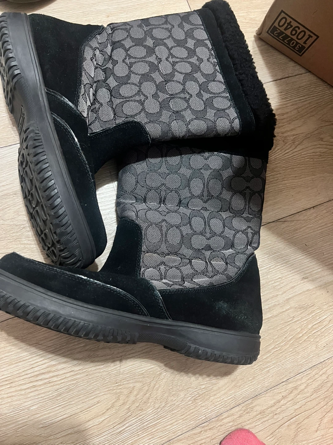 Coach Sherman Signature cold weather boots in black and smoke grey. They feature a signature logo pattern with a faux fur or shearling lining. Suede leather upper with signature jacquard fabric panels and a lined interior. Pull-on style, designed for warmth and insulation.