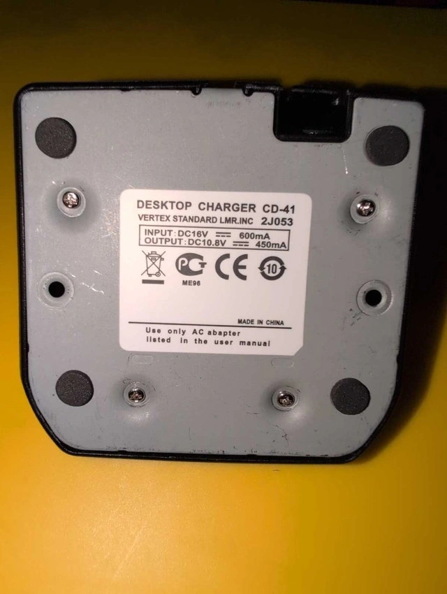 This is a brand new Vertex Standard Desktop Charger CD-41 with Power Supply BC-173SE, in good working condition. Model: CD-41, Input: DC16V 600mA, Output: DC10.8V 450mA. Power Supply Model: BC-173SE, Input: 120V 60Hz 25W, Output: 12VDC 1.0A. Keep your Vertex Standard devices fully charged and ready for action! If the ad is still posted, the item is available.