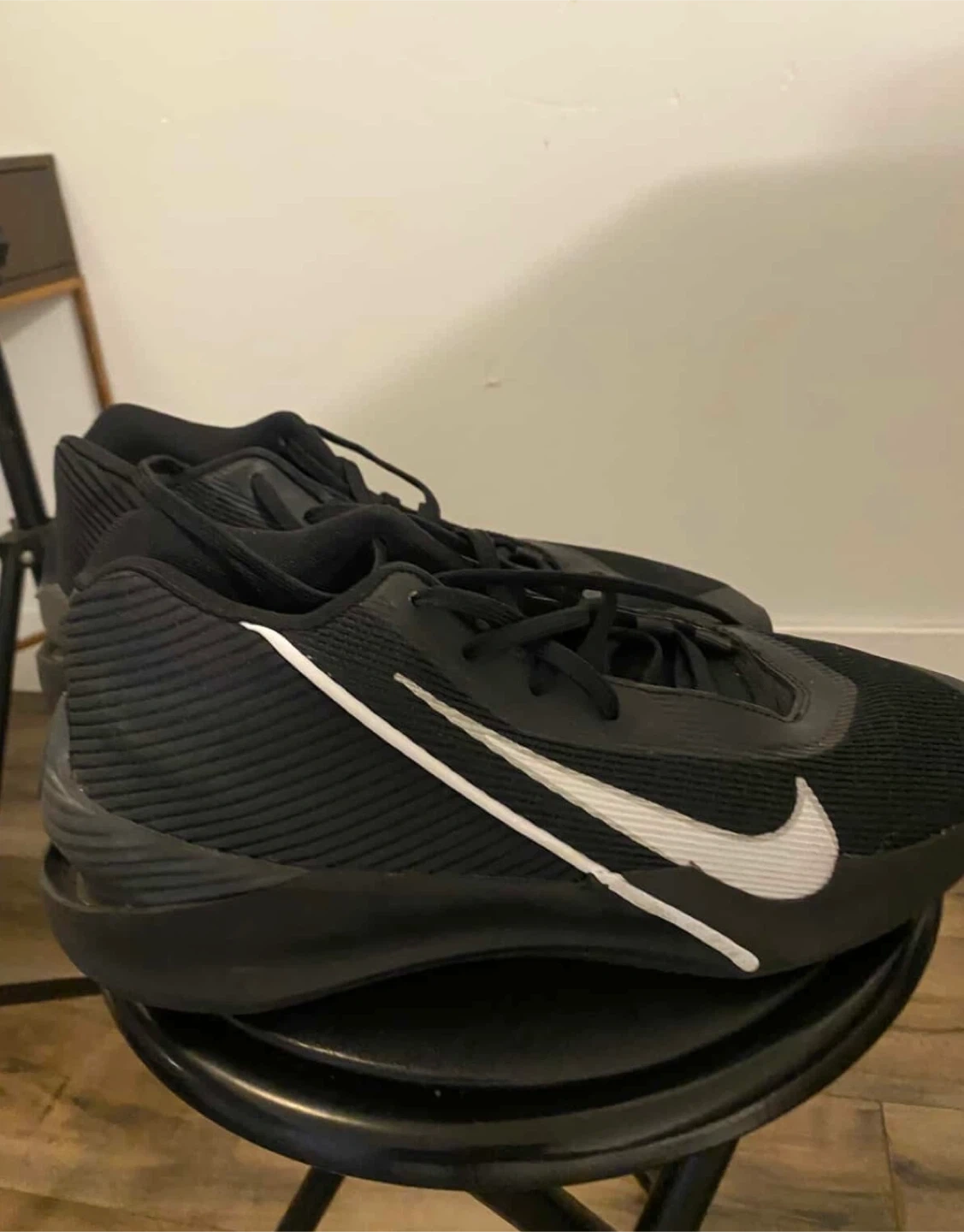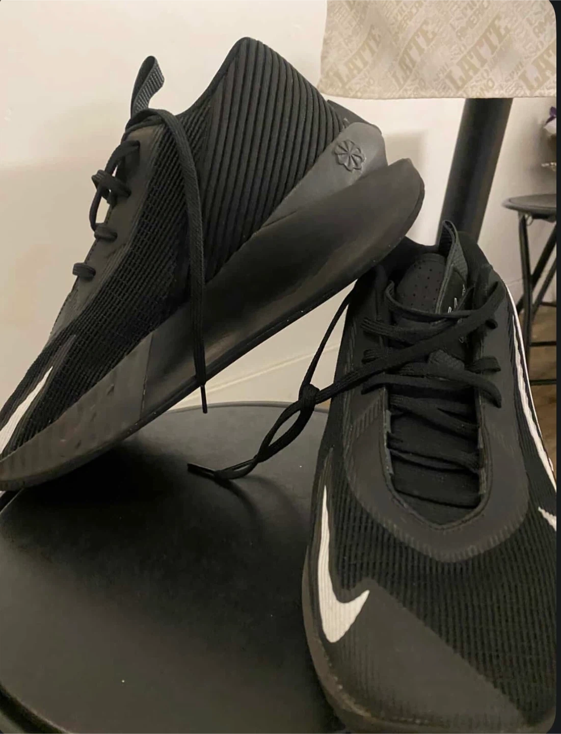 These are black Nike running shoes. They feature a breathable mesh upper and a durable rubber sole. Laces are black.