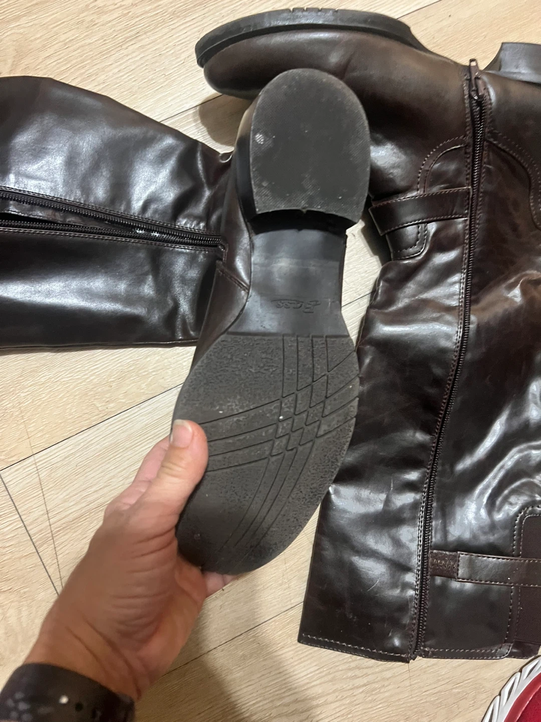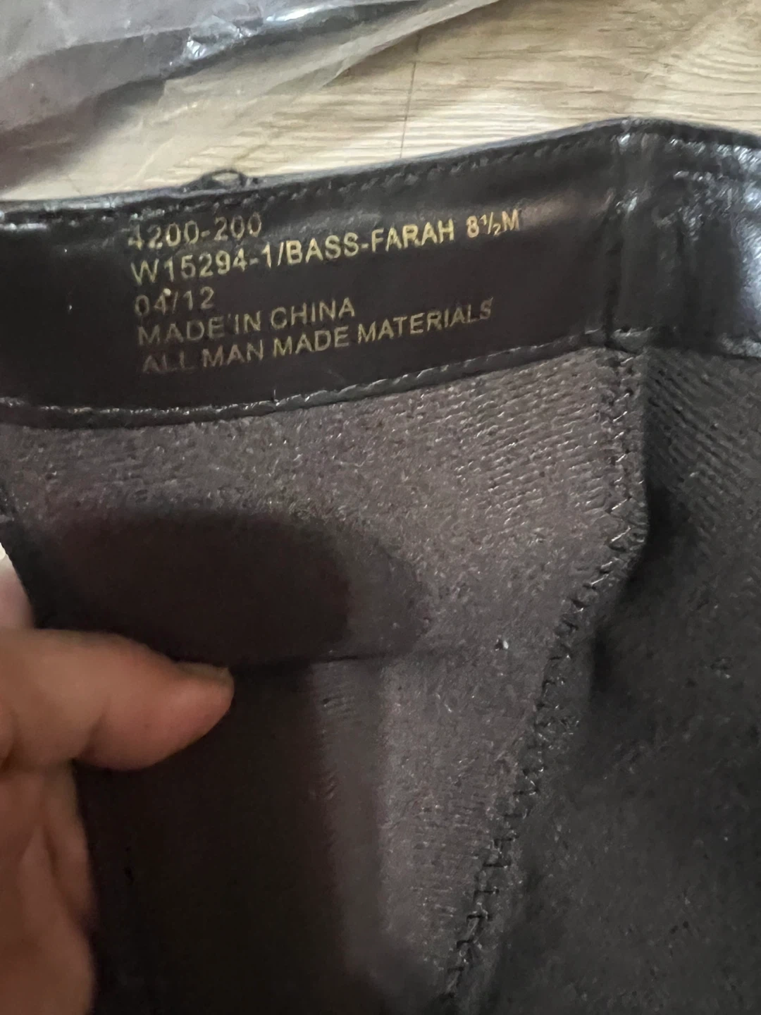 These Bass Farah boots are knee-high and made from brown faux leather. They feature a side zipper and buckle detailing. Size is 8.5M. Made in China. CASH ONLY!!