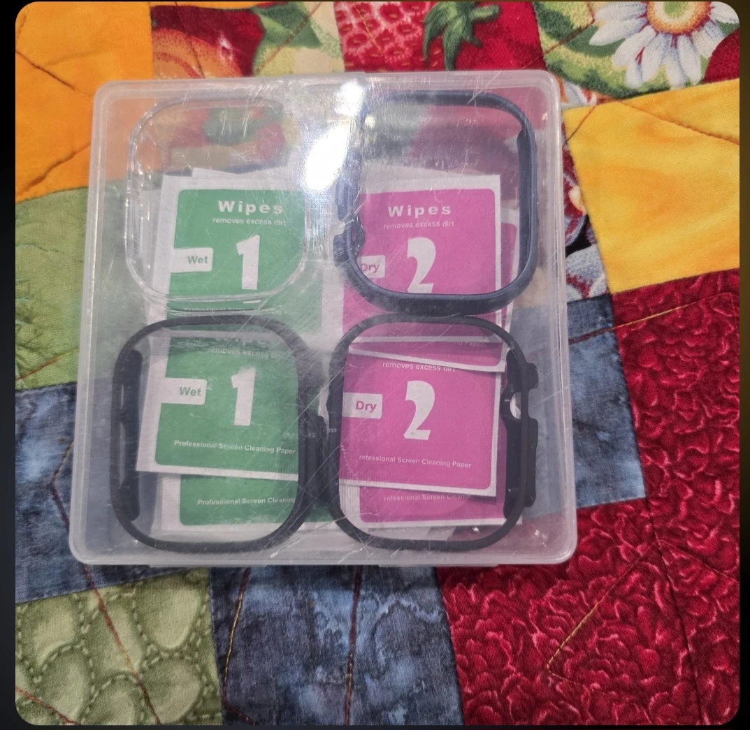 This kit includes screen protectors and frames for a device. It contains wet and dry wipes for cleaning before application. It's useful for maintaining the screen's clarity and preventing scratches.