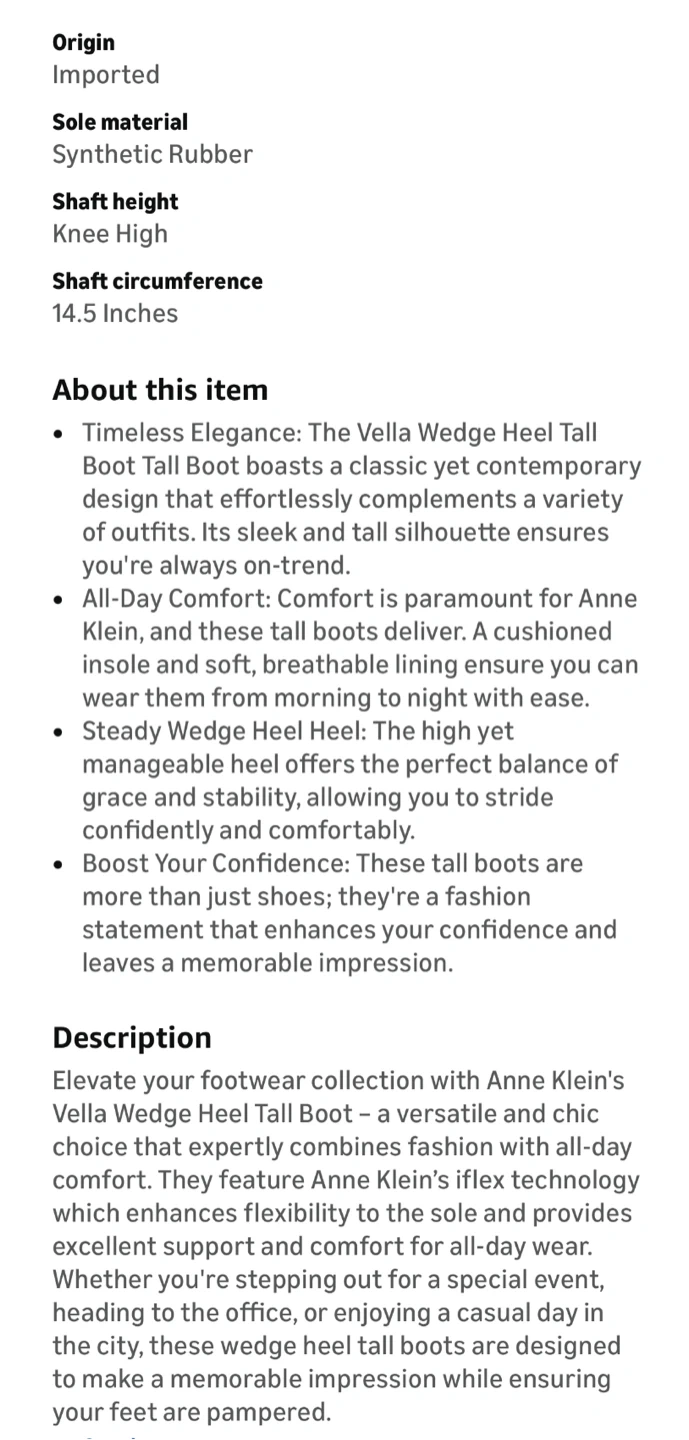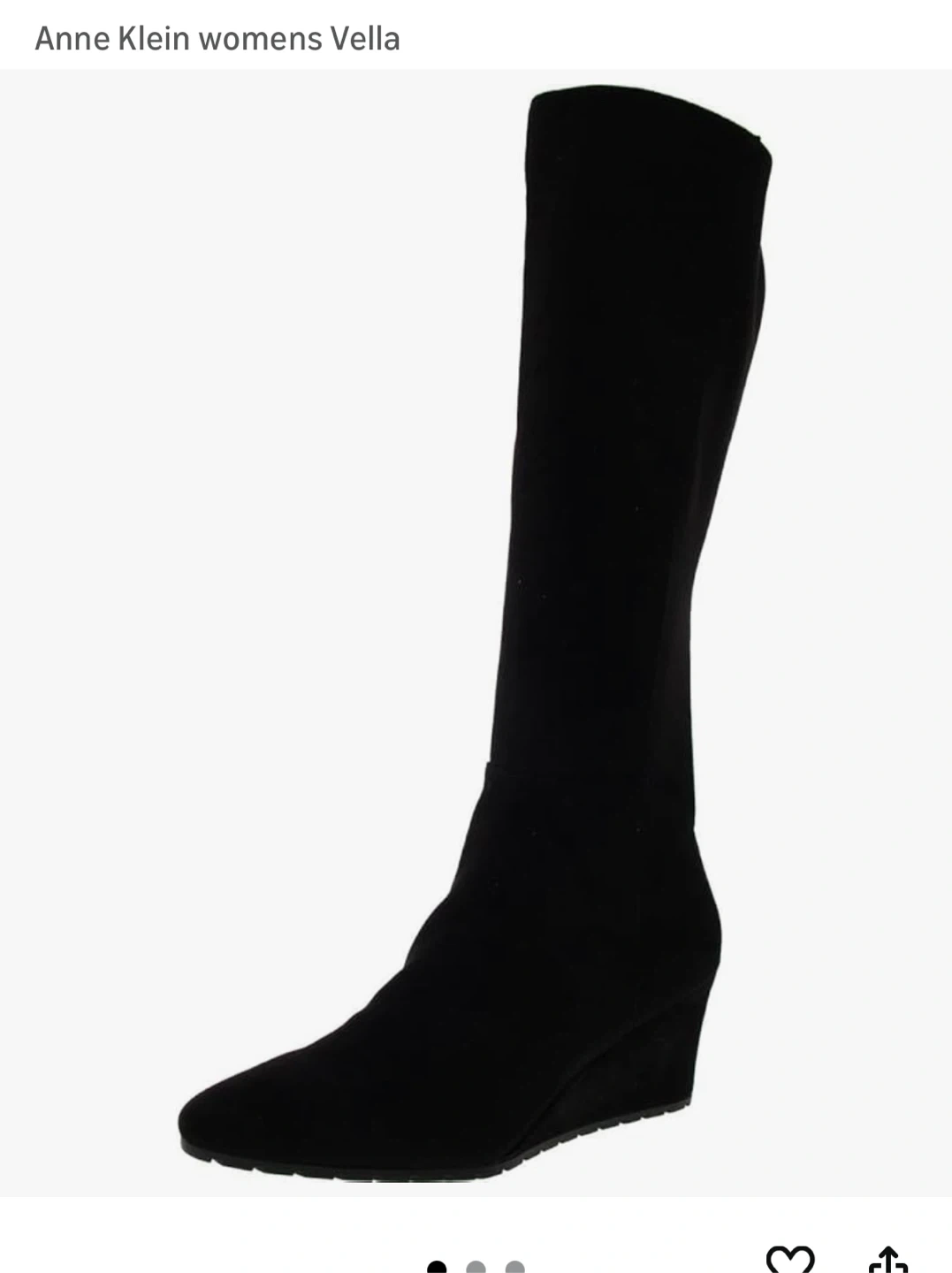 These Anne Klein Vella wedge heel tall boots are black suede with a knee-high shaft. They're made with a fabric upper, synthetic rubber sole, and a balance man-made lining. Shaft height is 14.5 inches.