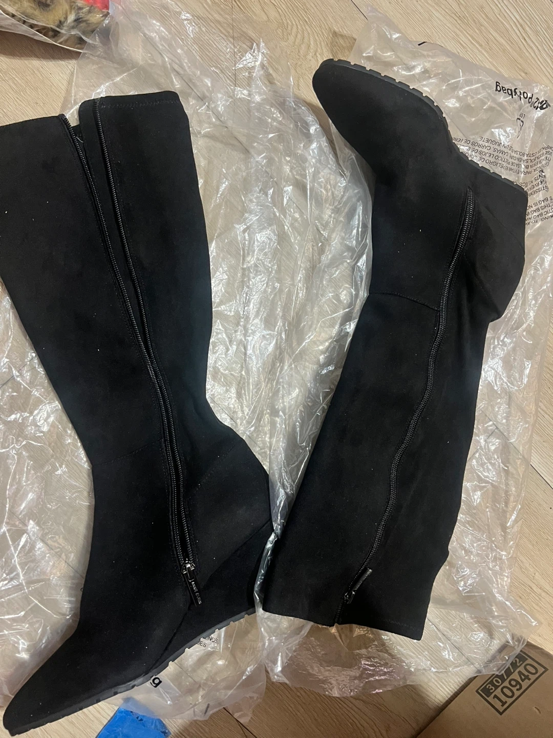 These Anne Klein Vella wedge heel tall boots are black suede with a knee-high shaft. They're made with a fabric upper, synthetic rubber sole, and a balance man-made lining. Shaft height is 14.5 inches.