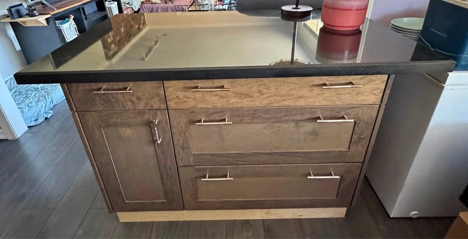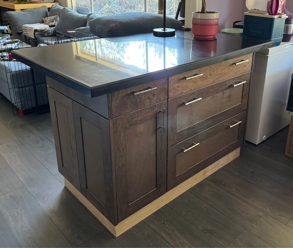 Solid wood custom made kitchen island with granite countertop. Dimensions: 36" deep x 59 1/4" wide x 36" high (including granite). The base is 26" deep x 48.5" wide without the granite. Feel free to message if you have any questions!
