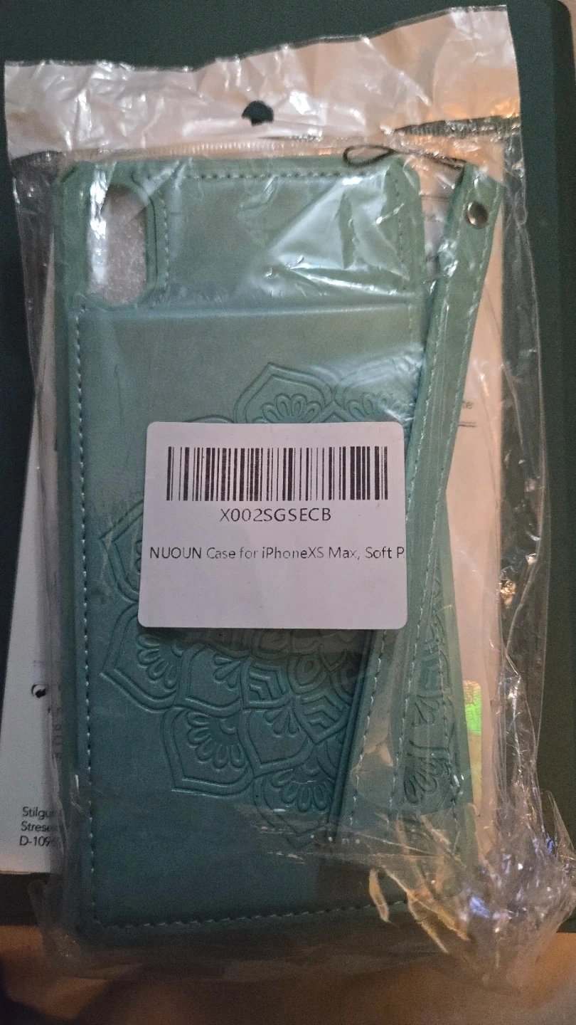 This is a NUOUN brand case for an iPhone XS Max. It's made of soft material and features a teal colour with a mandala design. It has a wrist strap attached.