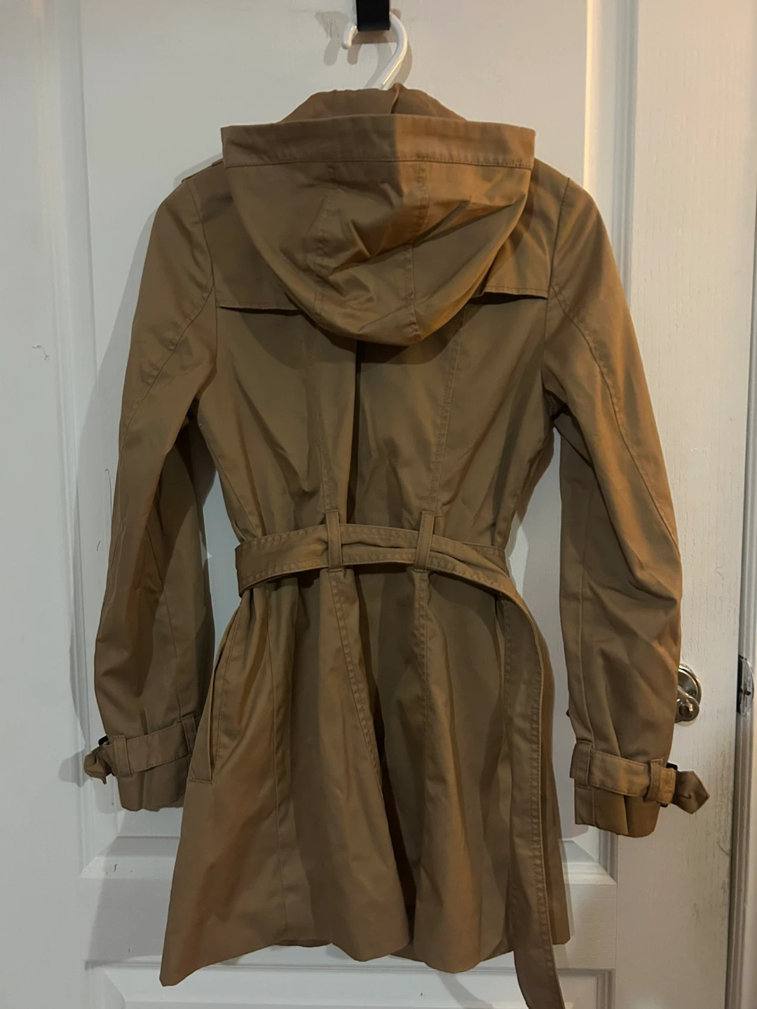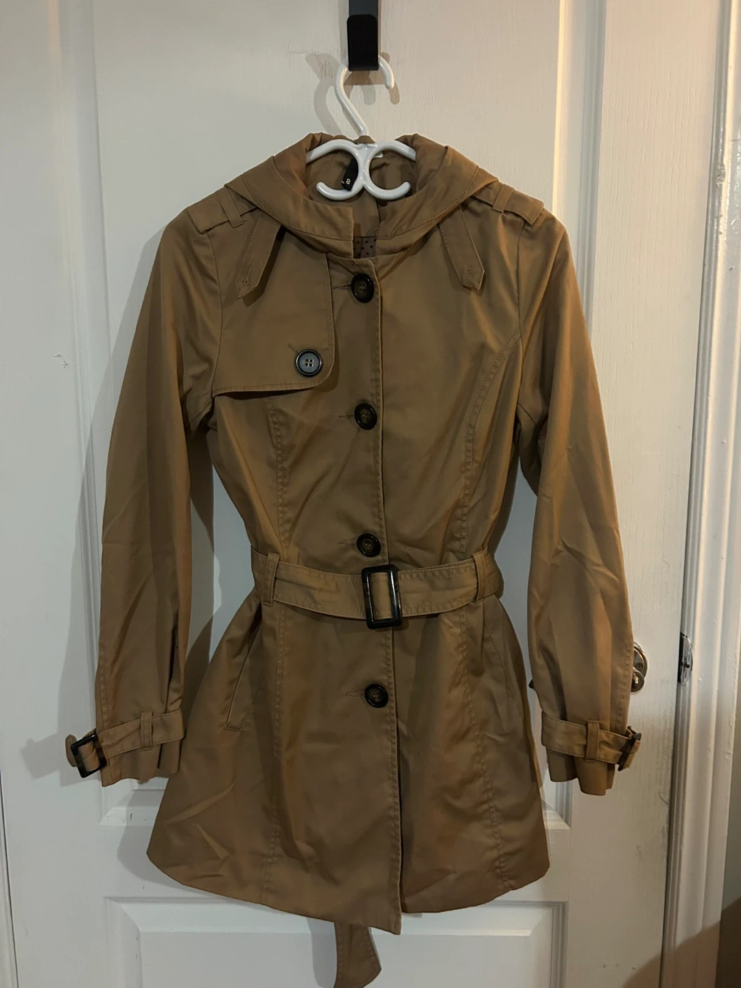 Brand New! This tan trench coat features a removable hood and a belted waist. It's made from a durable fabric. A great layering piece for transitional weather! size 8