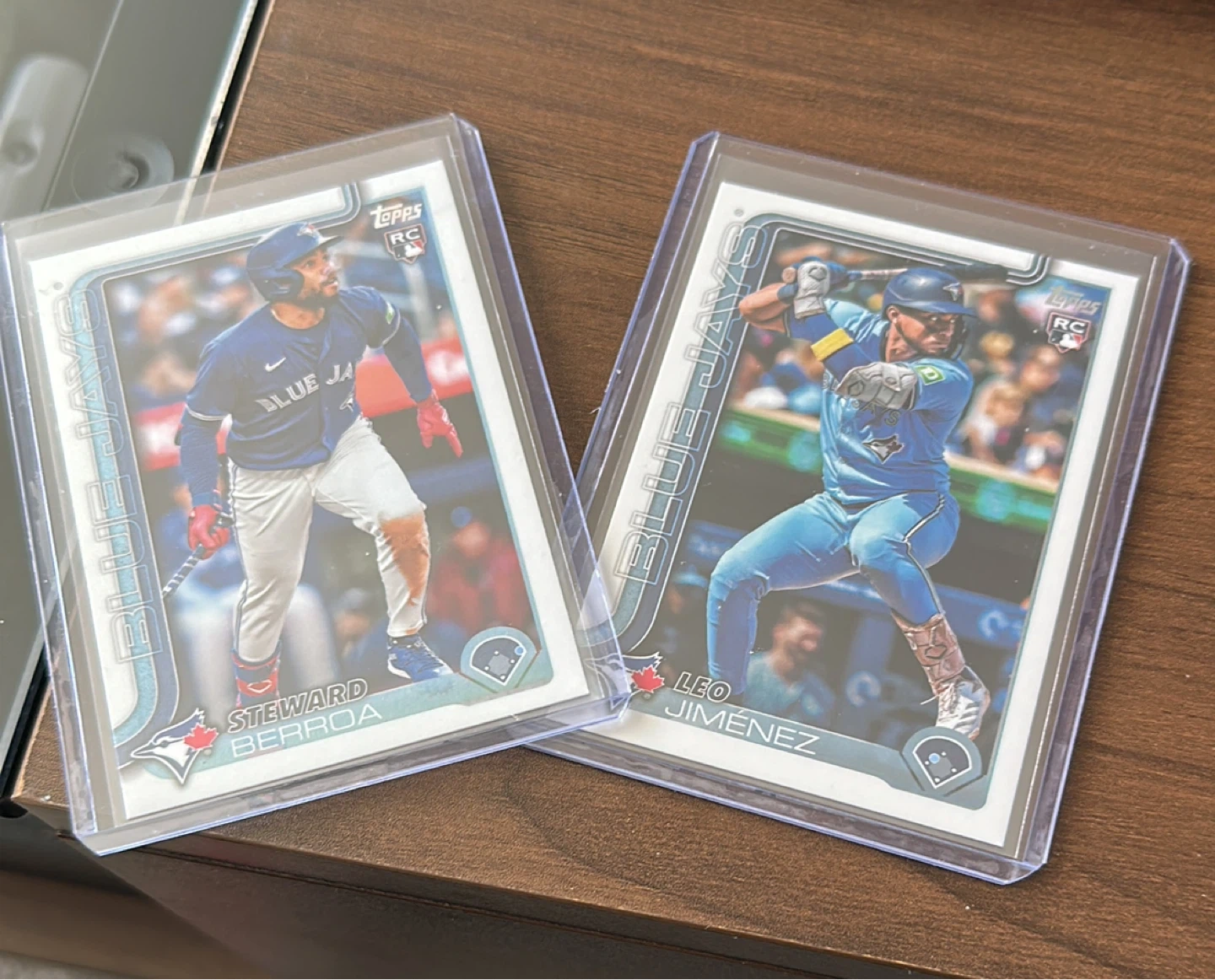 Two Topps rookie baseball cards featuring Blue Jays players. Includes Steward Berroa and Leo Jimenez. These cards are in protective sleeves.