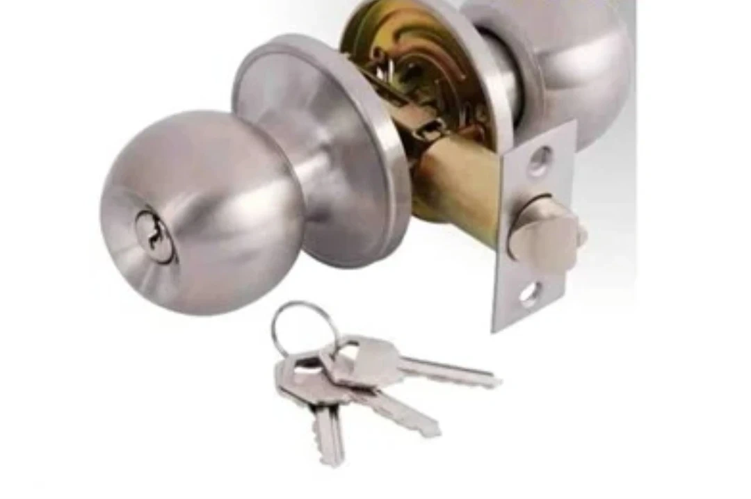 This is a satin nickel entry door knob set. It comes with three keys. The knob features a key lock mechanism on the exterior and a thumb turn on the interior.