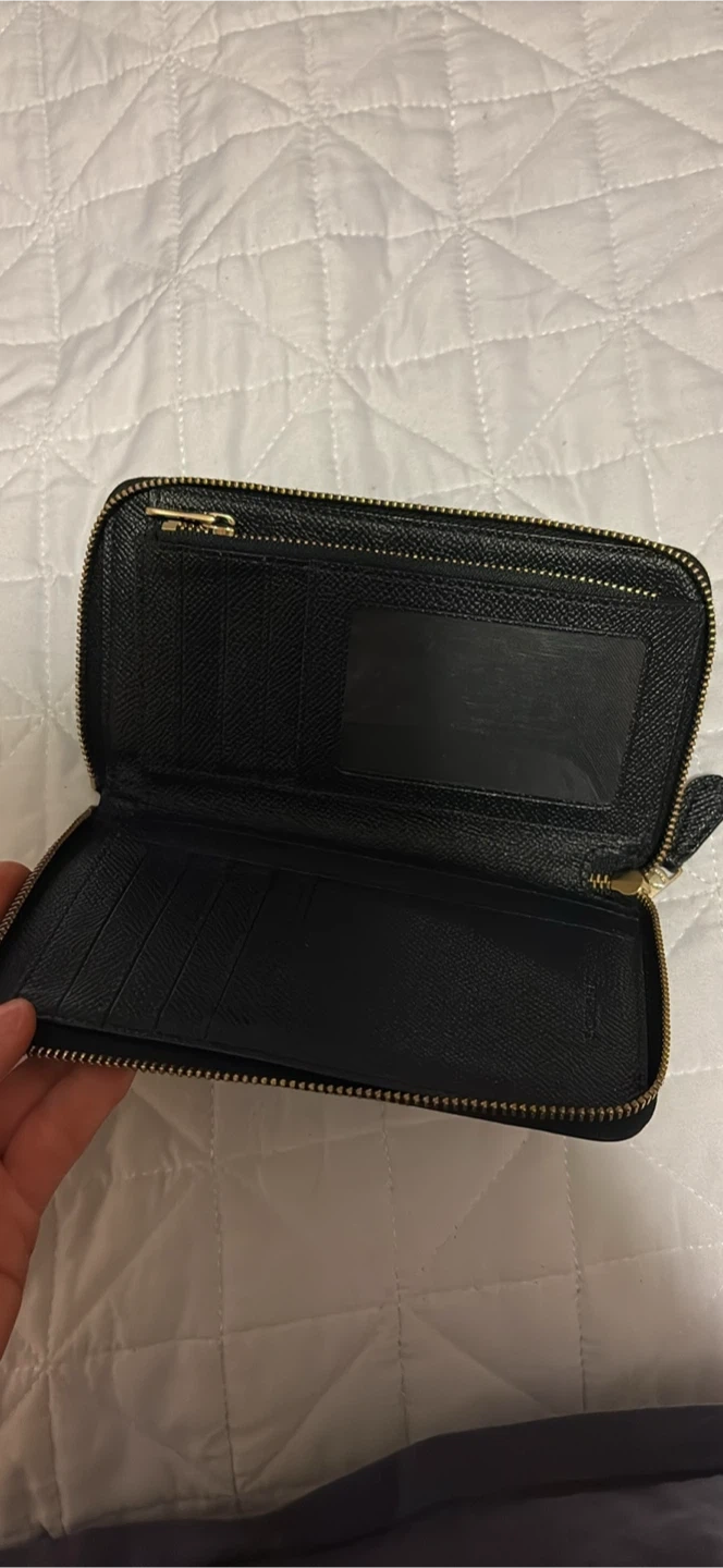 This is a Coach black leather zip-around wallet. It features multiple card slots and a zippered compartment inside. Genuine leather construction.