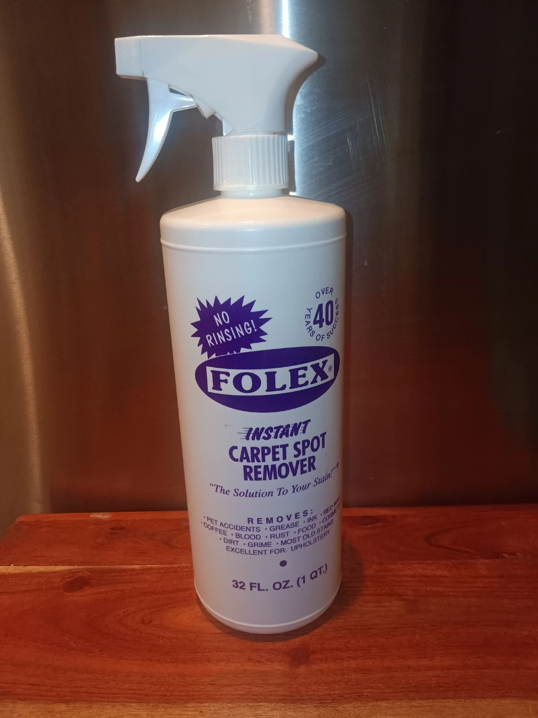FOLEX Instant Carpet Spot Remover cleans stains without rinsing! It's excellent for removing pet accidents, coffee, blood, grease, ink, and more. This formula is also safe for upholstery. 32 fl. oz. bottle.