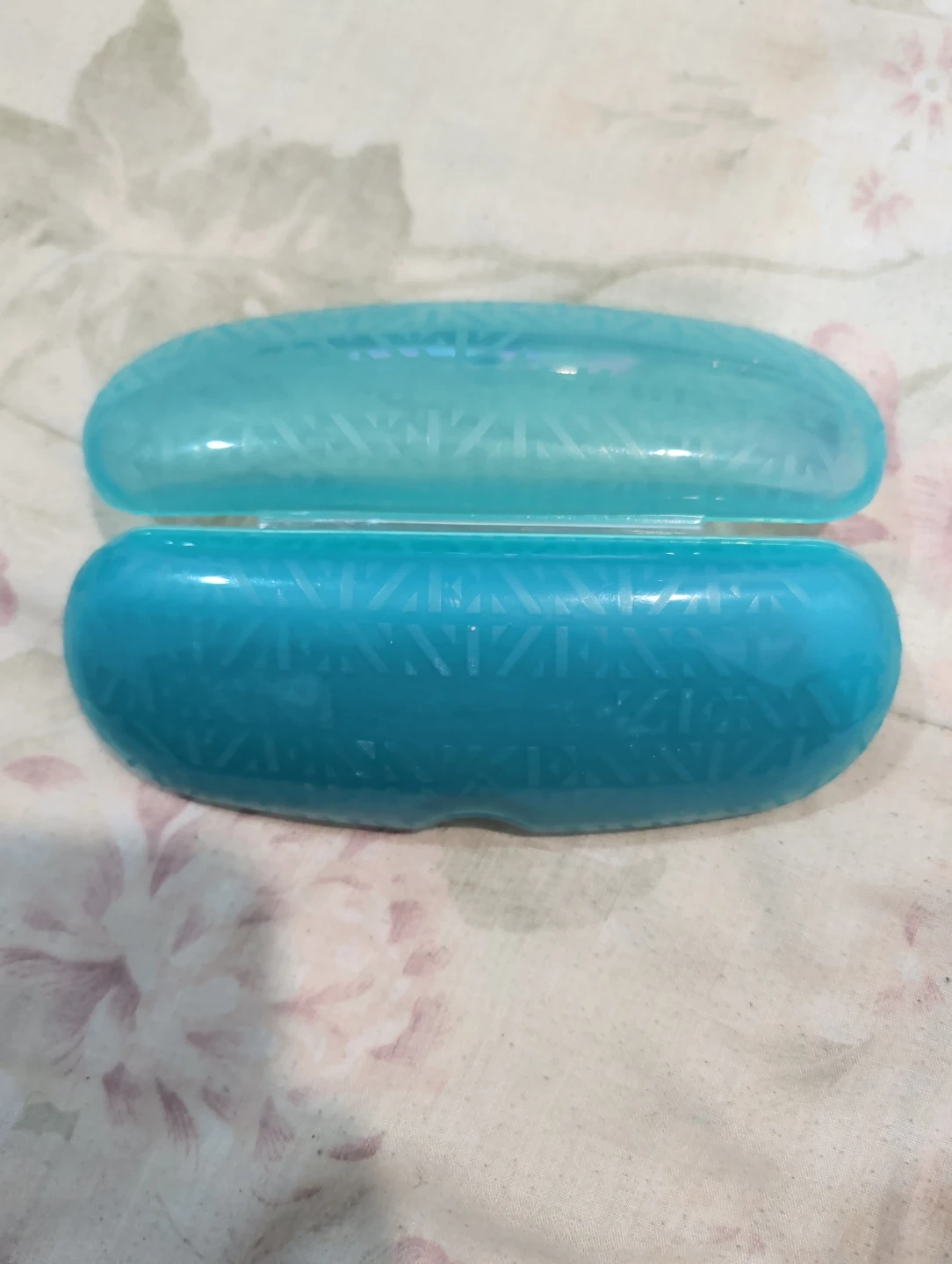 Hard eyeglass case in a teal colour, featuring the Zenni logo and the slogan 'Trendy, not spendy.' Includes a PD ruler for measuring pupillary distance. Case is made of plastic. Case is in great condition perfect for keeping your glasses safe