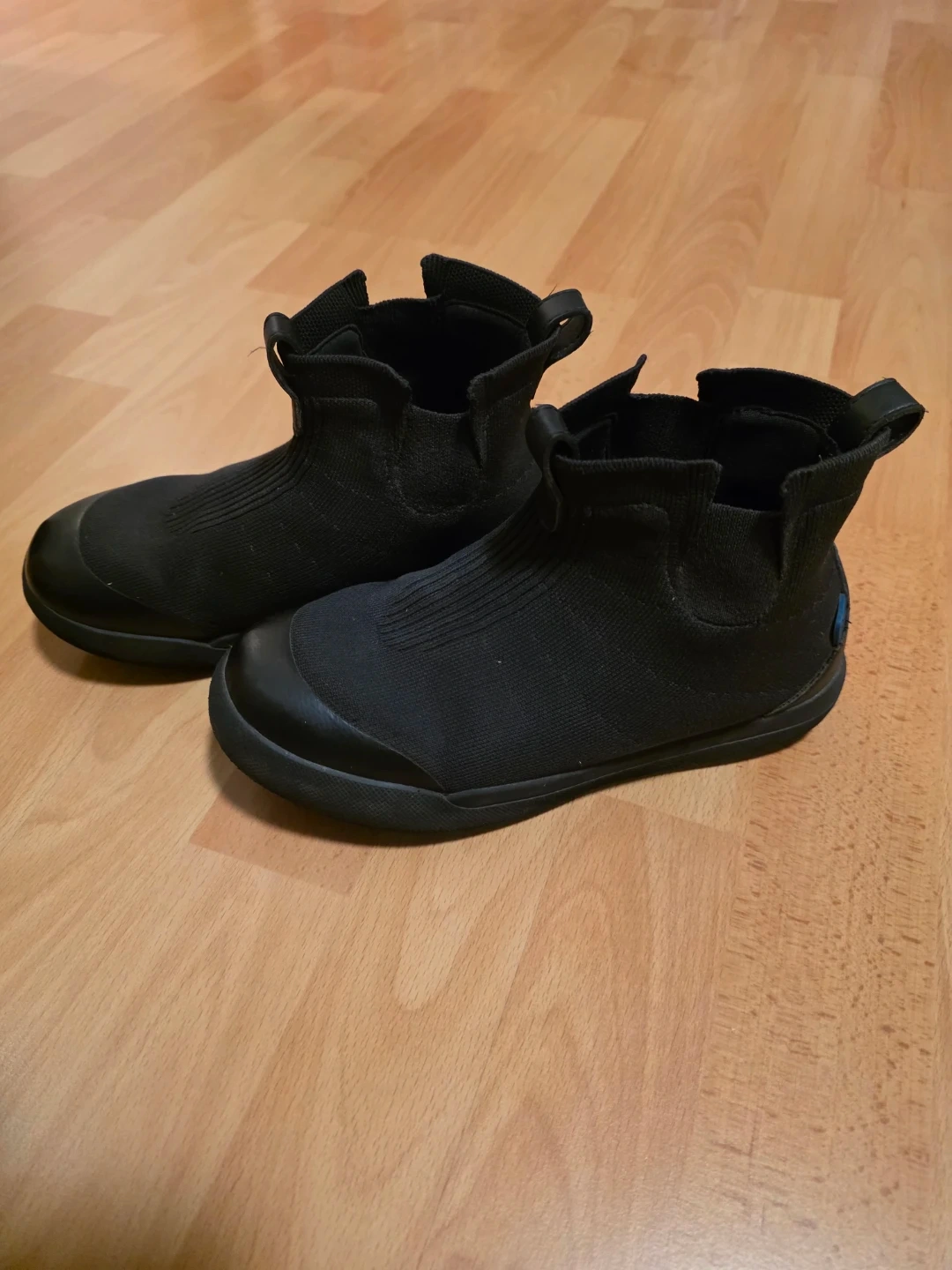 Versatile black waterproof Vessi slip-on kids ankle boots. Has a comfy knit upper and cool blue patterned soles. Reinforced toe cap with pull tabs on back for easy on/off. Pick up by Richmond South Arm.