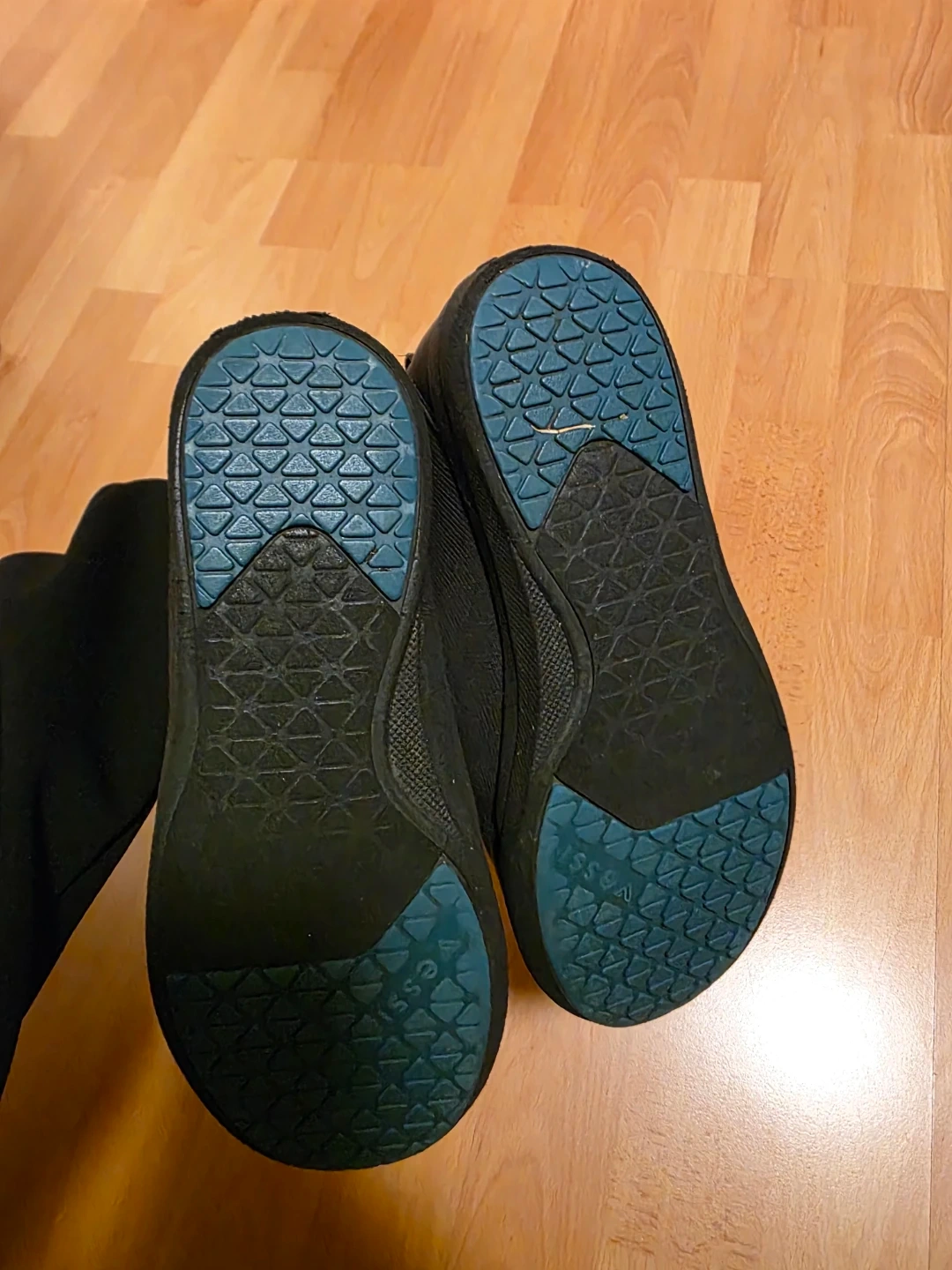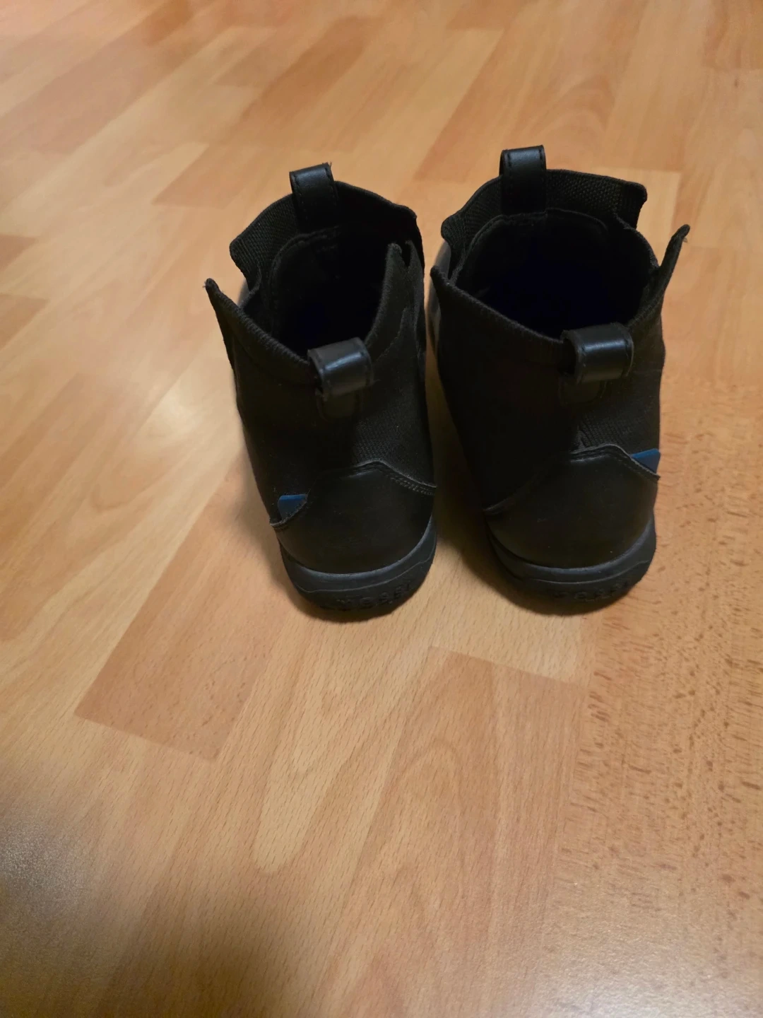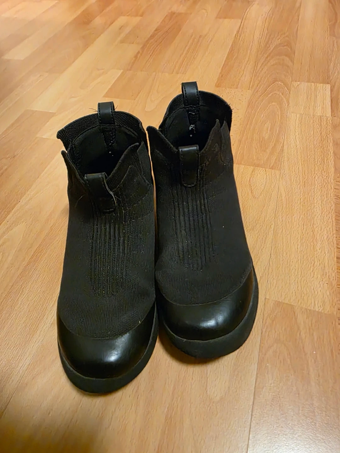 Versatile black waterproof Vessi slip-on kids ankle boots. Has a comfy knit upper and cool blue patterned soles. Reinforced toe cap with pull tabs on back for easy on/off. Pick up by Richmond South Arm.