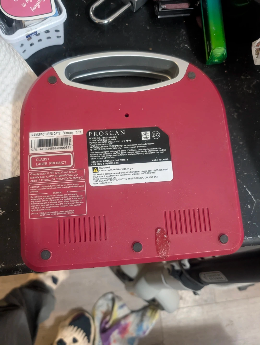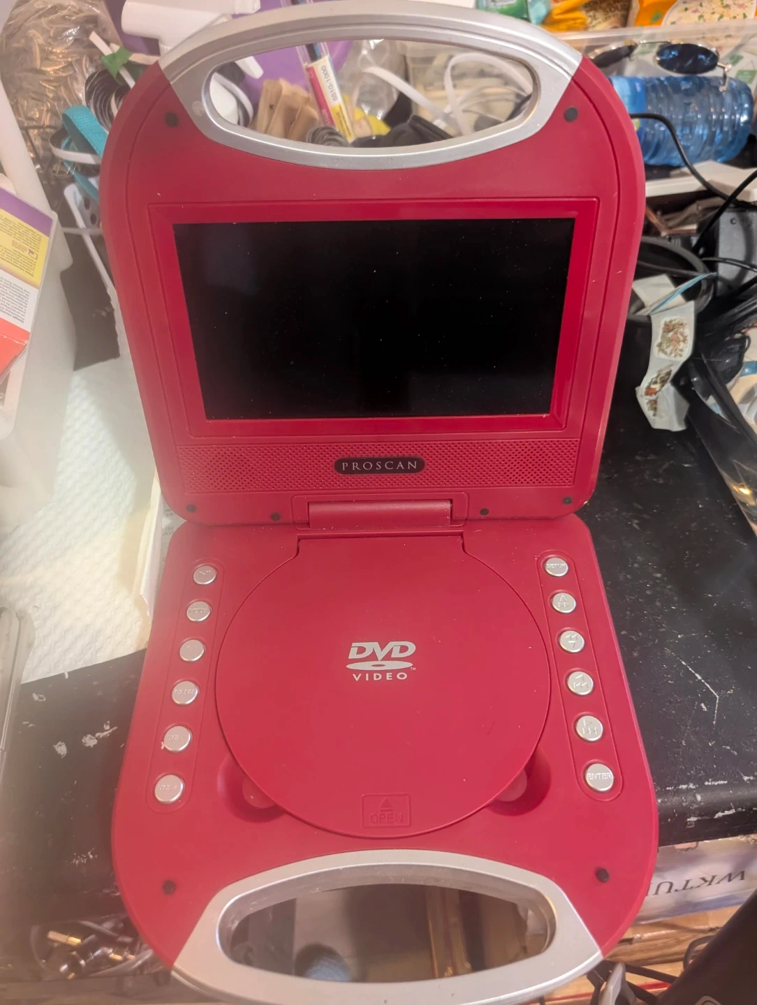 Proscan portable DVD player in red. Features a swivel screen and built-in speakers. Manufactured February 2015. It's great for travel!