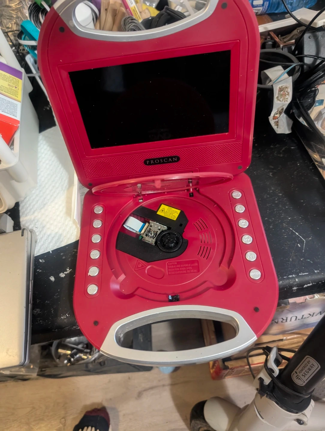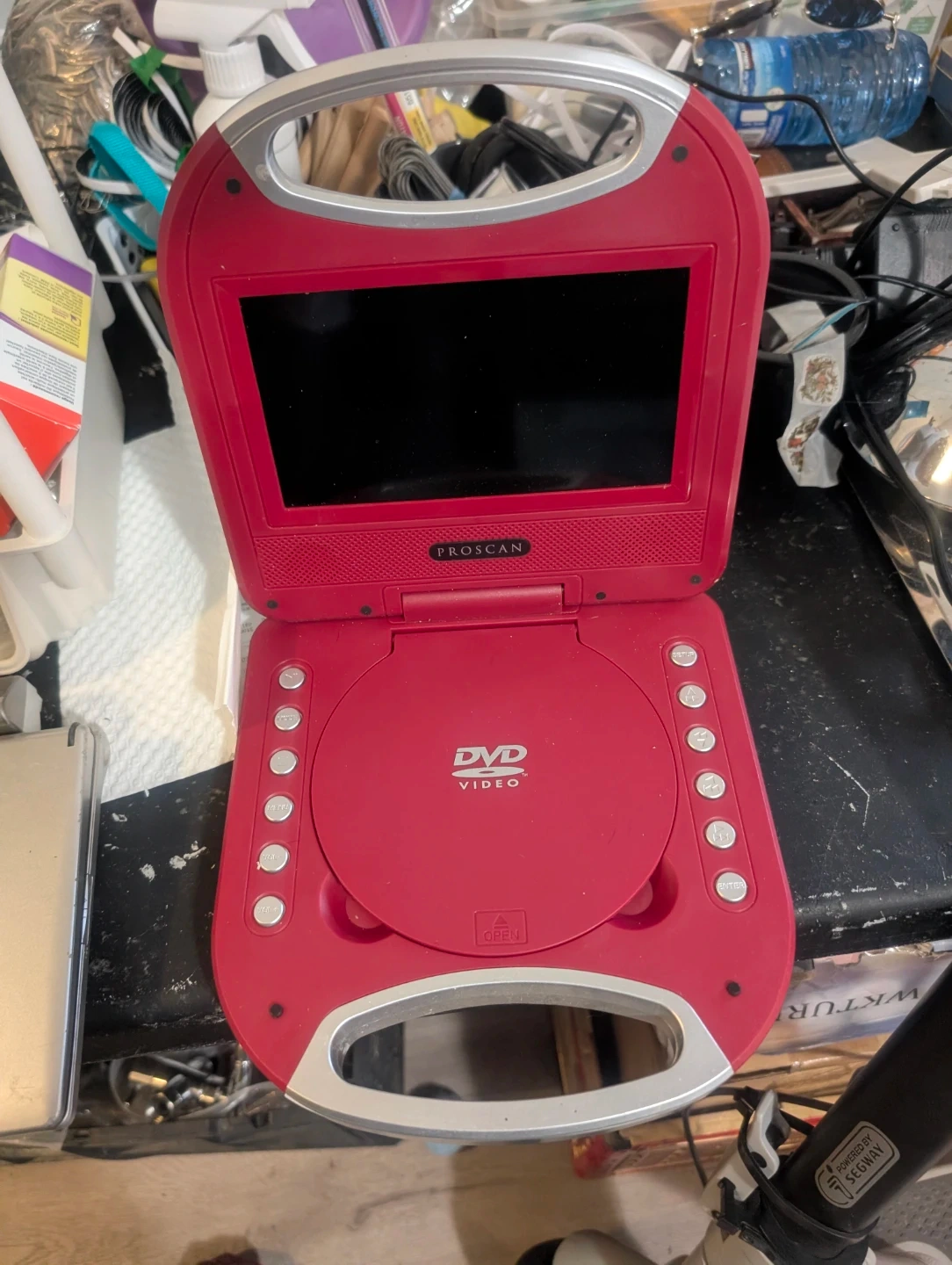 Proscan portable DVD player in red. Features a swivel screen and built-in speakers. Manufactured February 2015. It's great for travel!