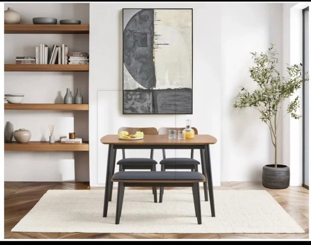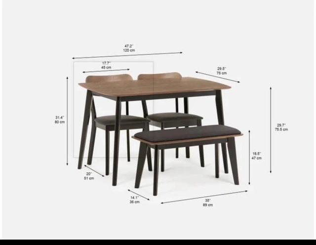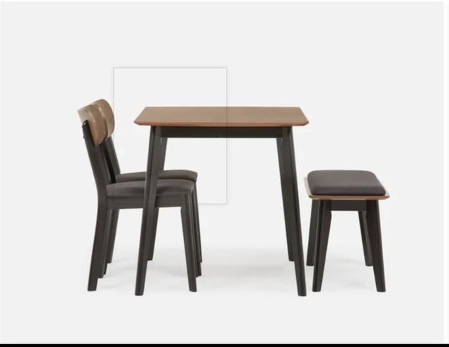 This Structube Tavel dining set includes a table, two chairs, and a bench, perfect for a small dining space. The set is in used condition, gently used but well cared for. Table dimensions: 47.2" (120 cm) length x 29.5" (75 cm) width. Chair dimensions: 17.7" (45 cm) width x 31.4" (80 cm) height. Bench dimensions: 35" (89 cm) length x 18.5" (47 cm) height. This set is a fantastic find for anyone looking to add a touch of modern elegance to their home! This dining set is still available.