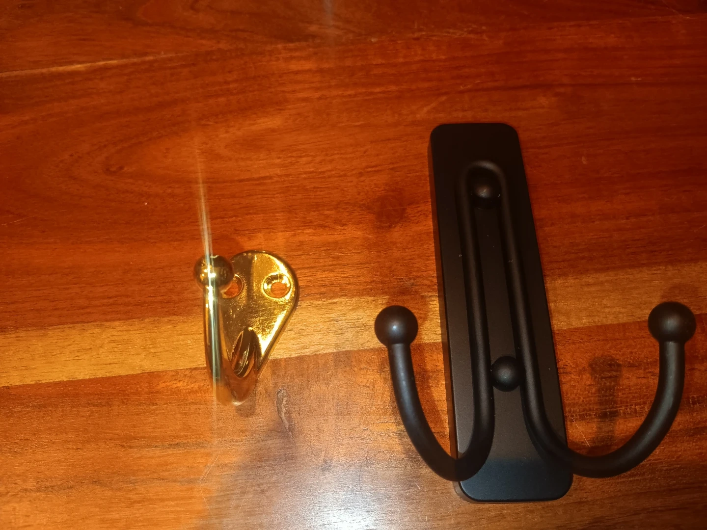 Includes a black double coat hook and a single gold hook. These hooks are great for organizing jackets, bags, or towels. They're made from metal.