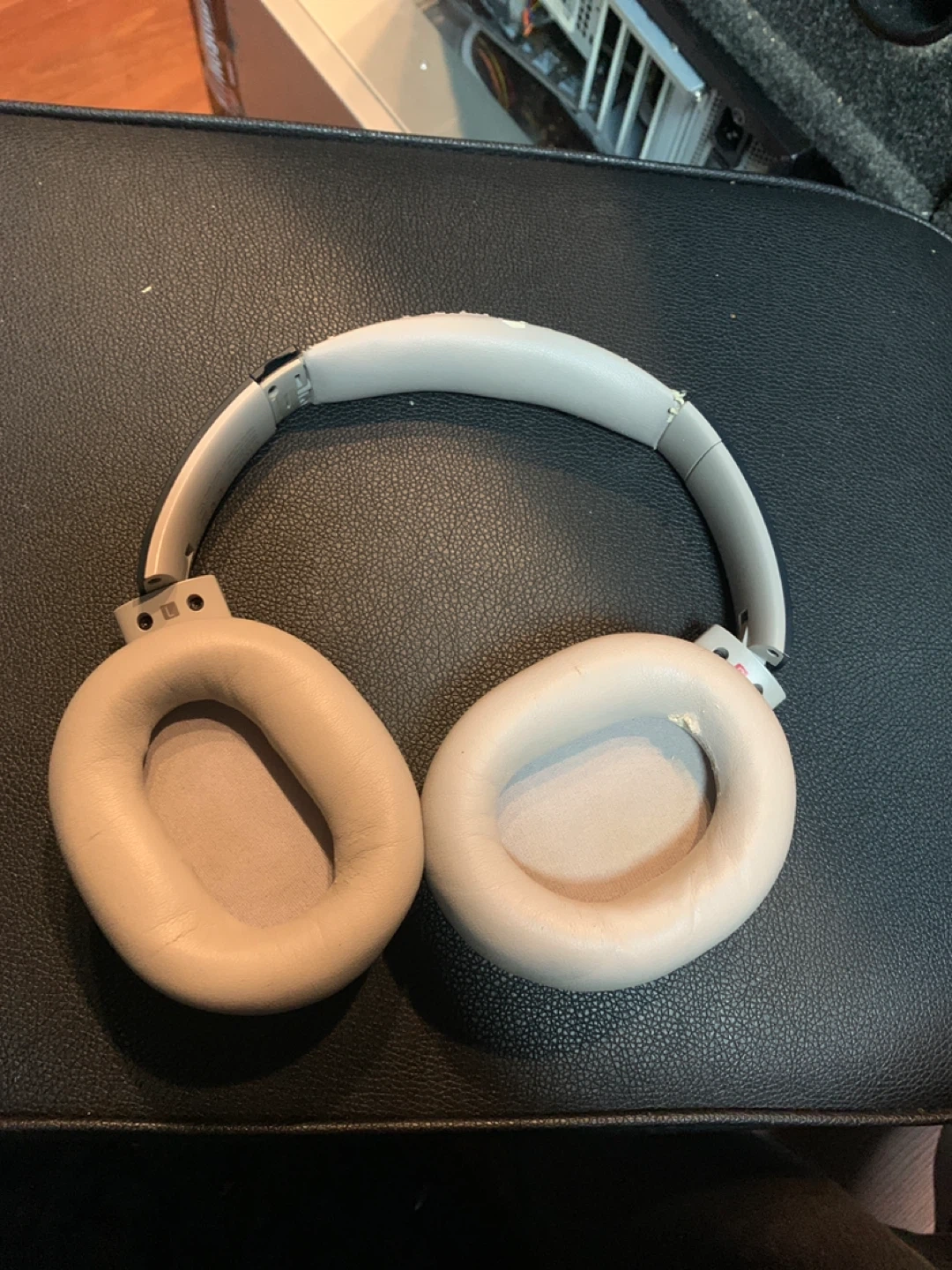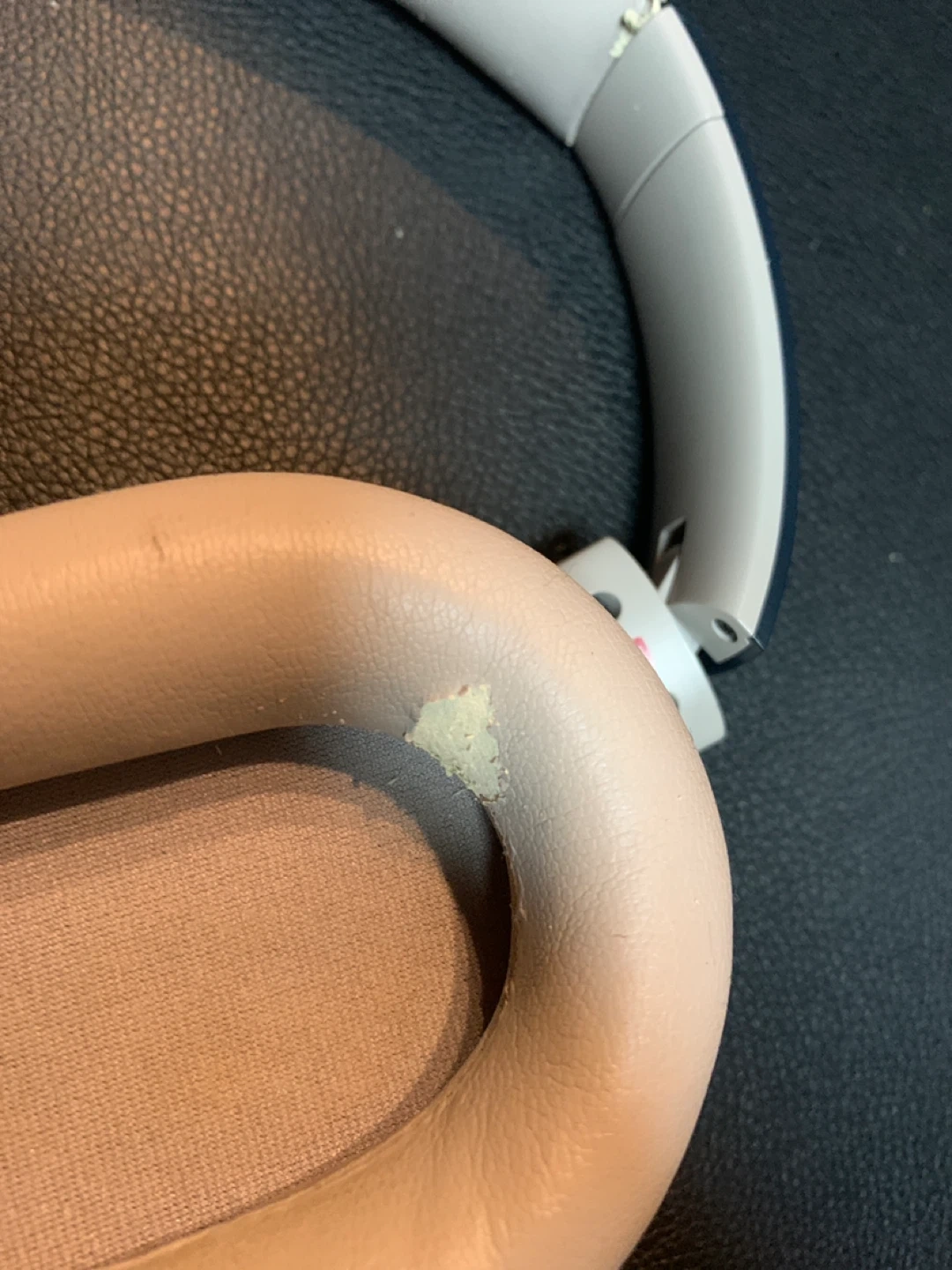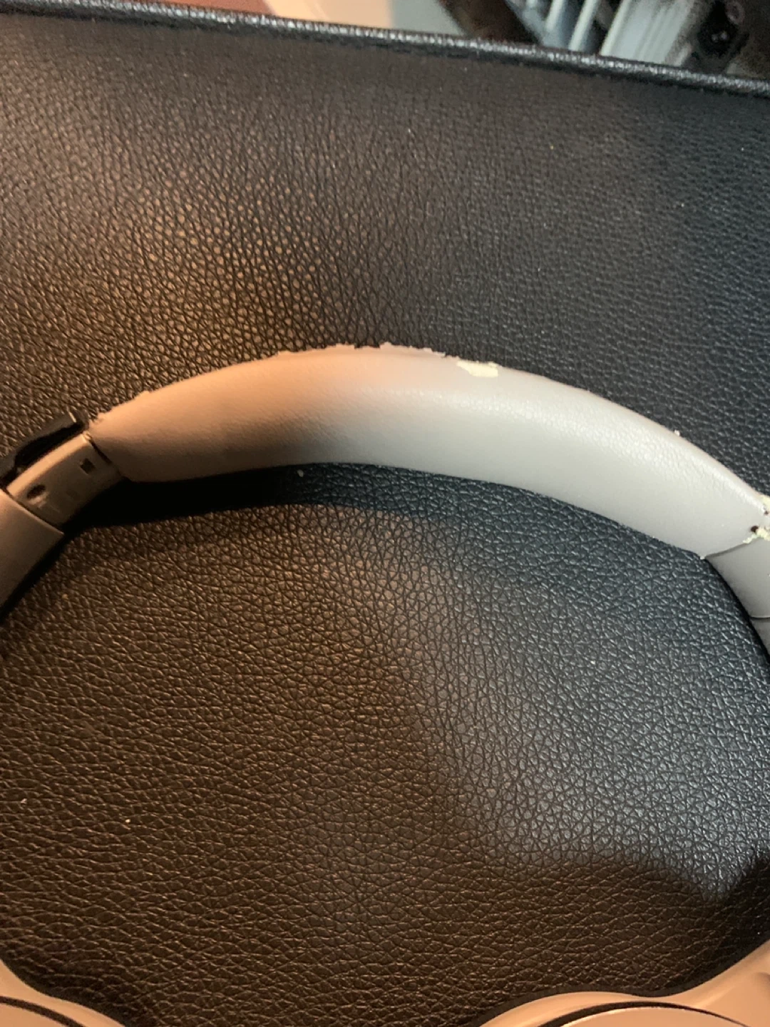 These are Cleer headphones in a light grey colour. The earcups are beige faux leather. They feature a USB-C charging port. Some wear is visible on the headband and earcups.