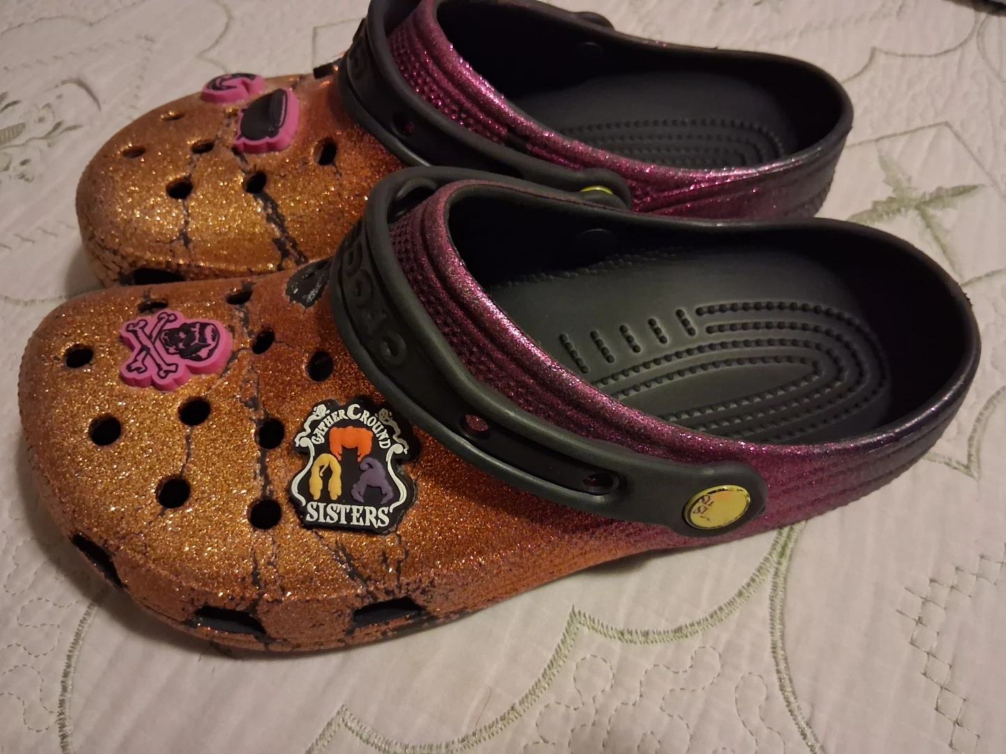 Sparkly glitter Crocs clogs with fun Jibbitz charms. These shoes are size 8. They're a shimmering copper color with pink accents.