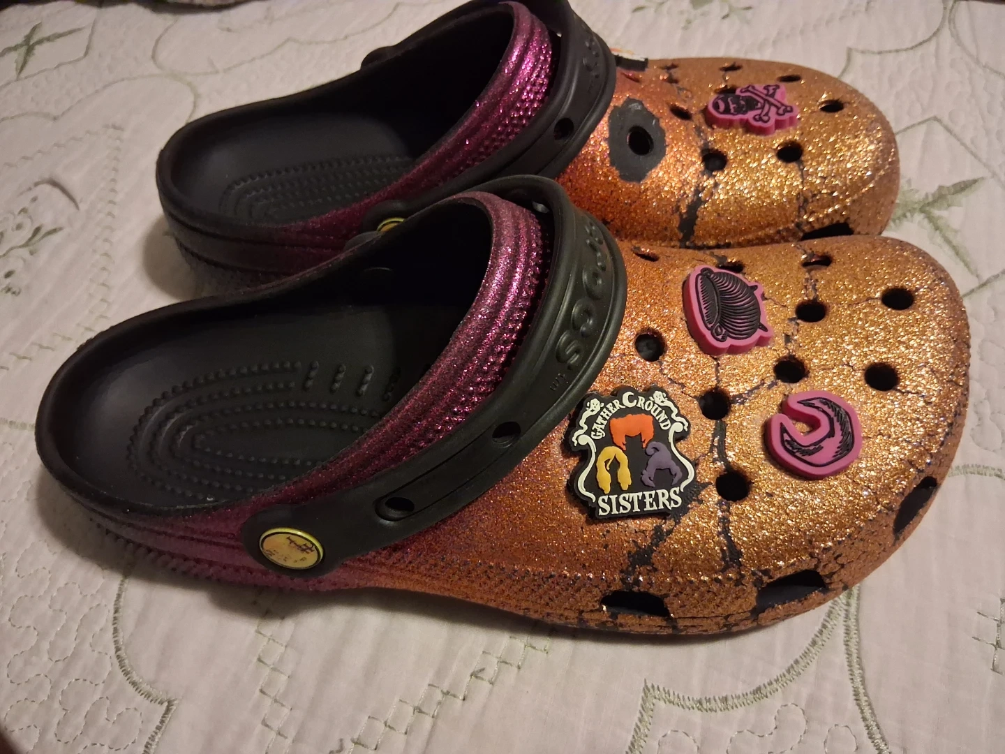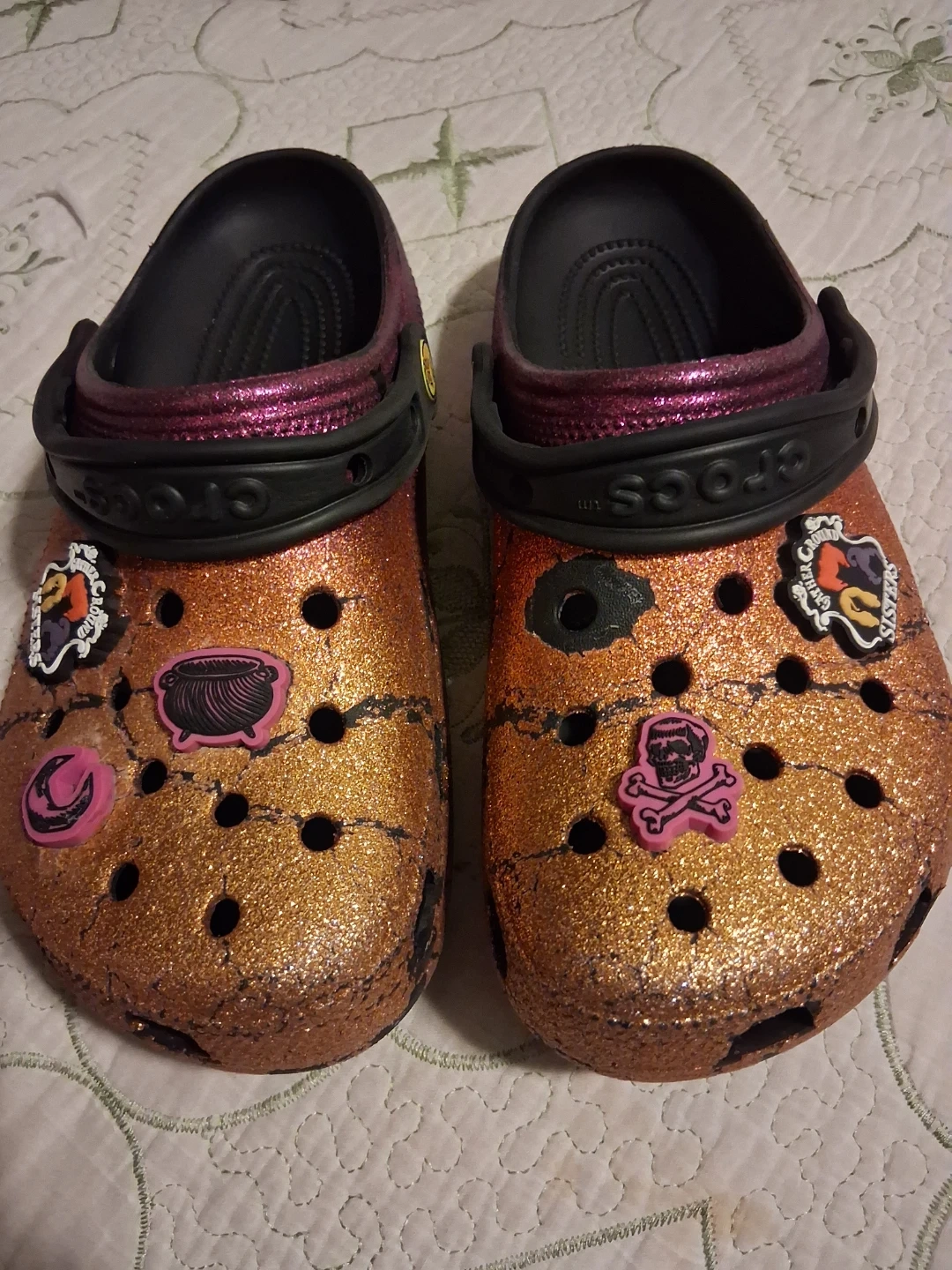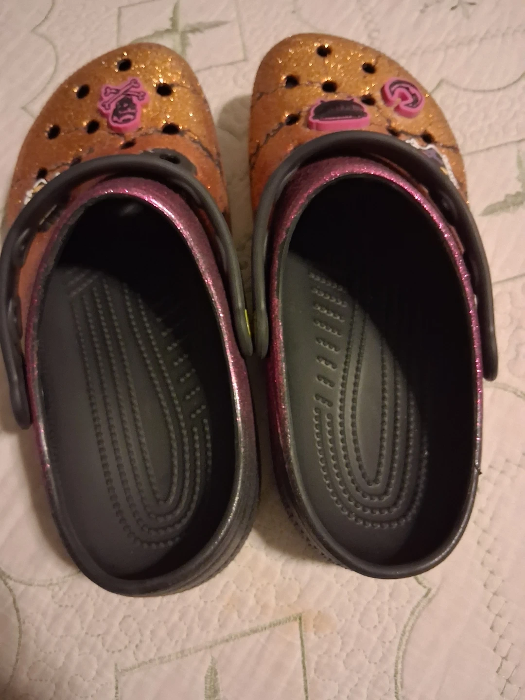 Sparkly glitter Crocs clogs with fun Jibbitz charms. These shoes are size 8. They're a shimmering copper color with pink accents.