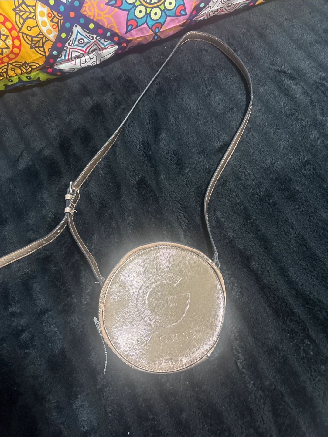 This is a bronze-toned round crossbody bag from Guess. It features a prominent 'G' logo on the front. It's perfect for carrying your essentials on the go! Pick up cash only