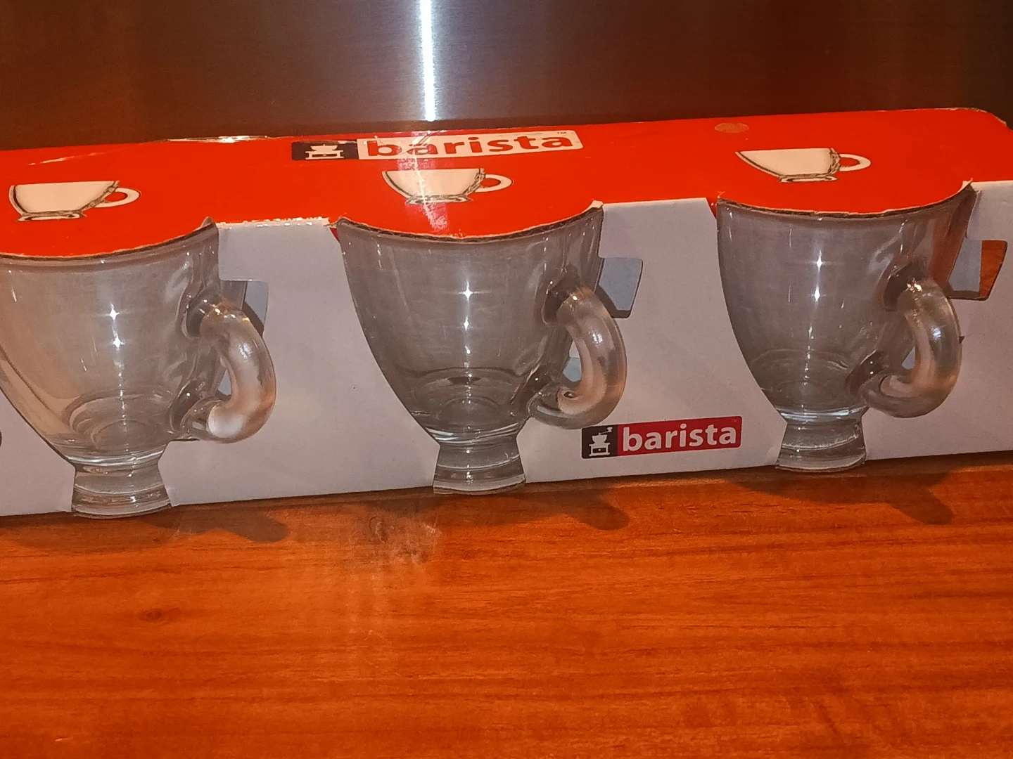 Set of 3 clear glass espresso cups. These cups have a classic design with sturdy handles. Perfect for enjoying your morning espresso or for serving guests!
