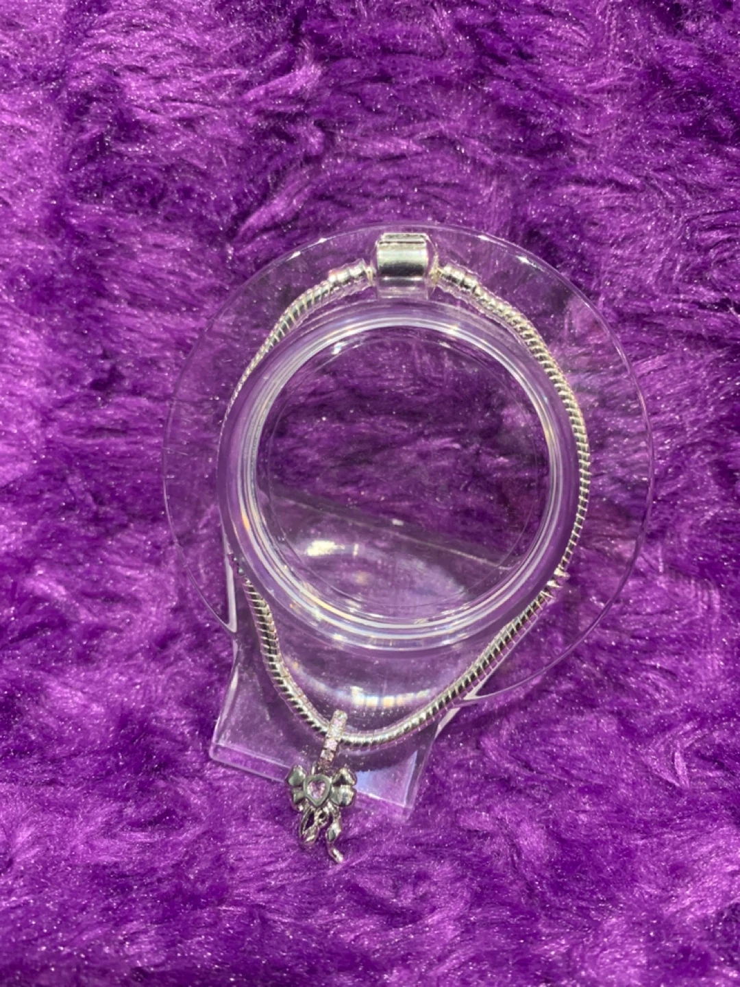 Pandora sterling silver snake chain bracelet. It's a 7.5-inch length and comes with a decorative charm featuring a pink heart and bow design. This bracelet is perfect for adding a touch of sparkle to any outfit!