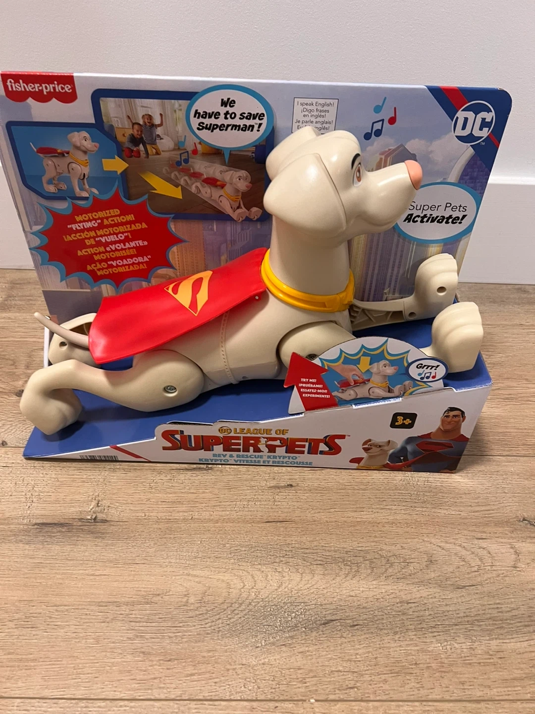 This is the Fisher-Price DC League of Super-Pets Krypto toy with motorized flying action. It's designed for kids to activate and have fun with their favourite superhero dog. It's perfect for young fans of the DC League of Super-Pets.