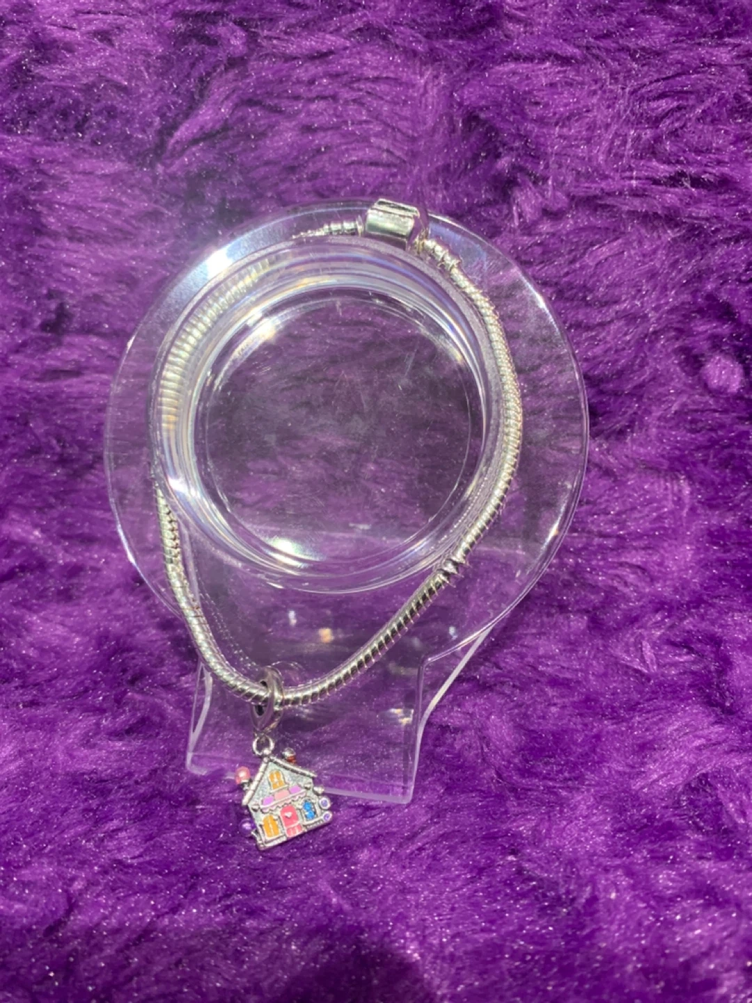 This is a silver-toned charm bracelet. It features a detailed house-shaped charm with colourful accents. It has a snake chain design and a secure clasp.