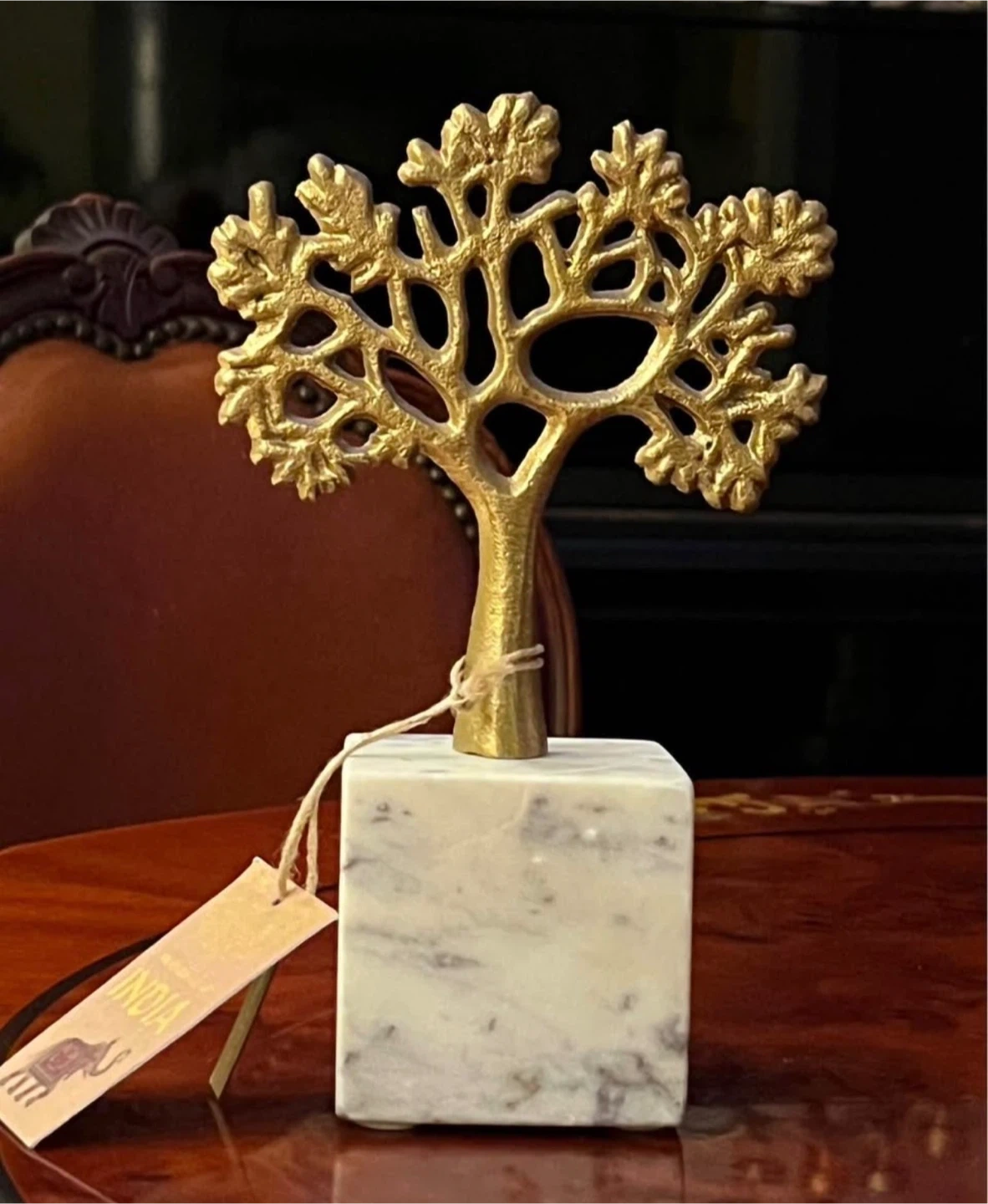 A decorative tree sculpture with intricate branches, crafted from metal and mounted on a solid marble base. This piece adds a touch of elegance to any tabletop or shelf.