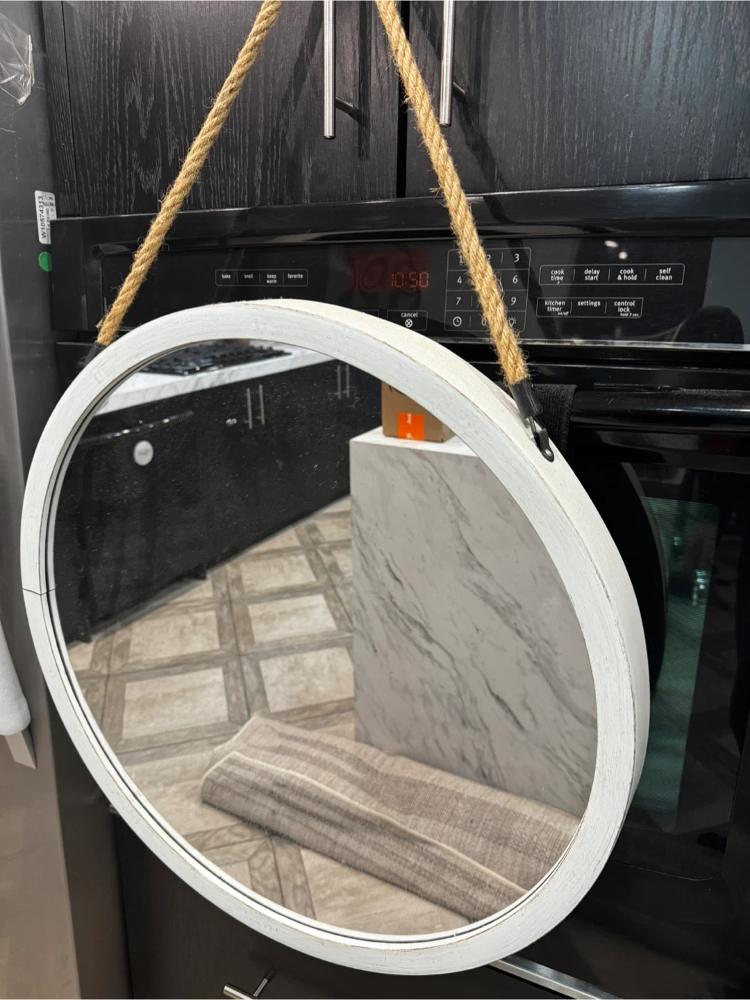 This oval wall mirror features a distressed white wood frame and a rustic rope hanger. It's approximately 21 inches in diameter. Add a touch of charm to any room!