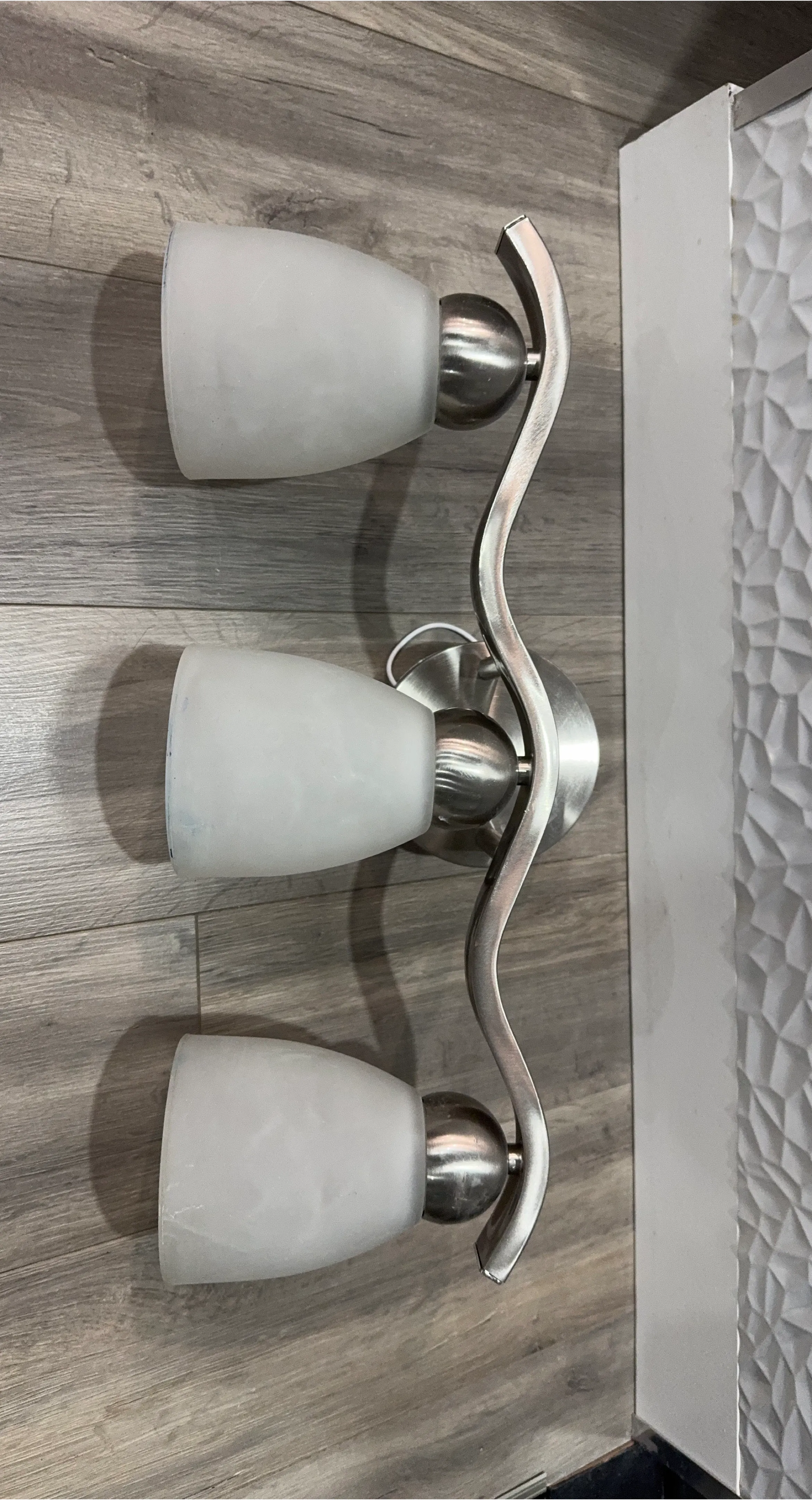 This is a 3-light vanity fixture with frosted glass shades. The fixture has a brushed nickel finish. It's designed for wall mounting, typically above a bathroom mirror. Suitable for providing ambient lighting in a washroom.