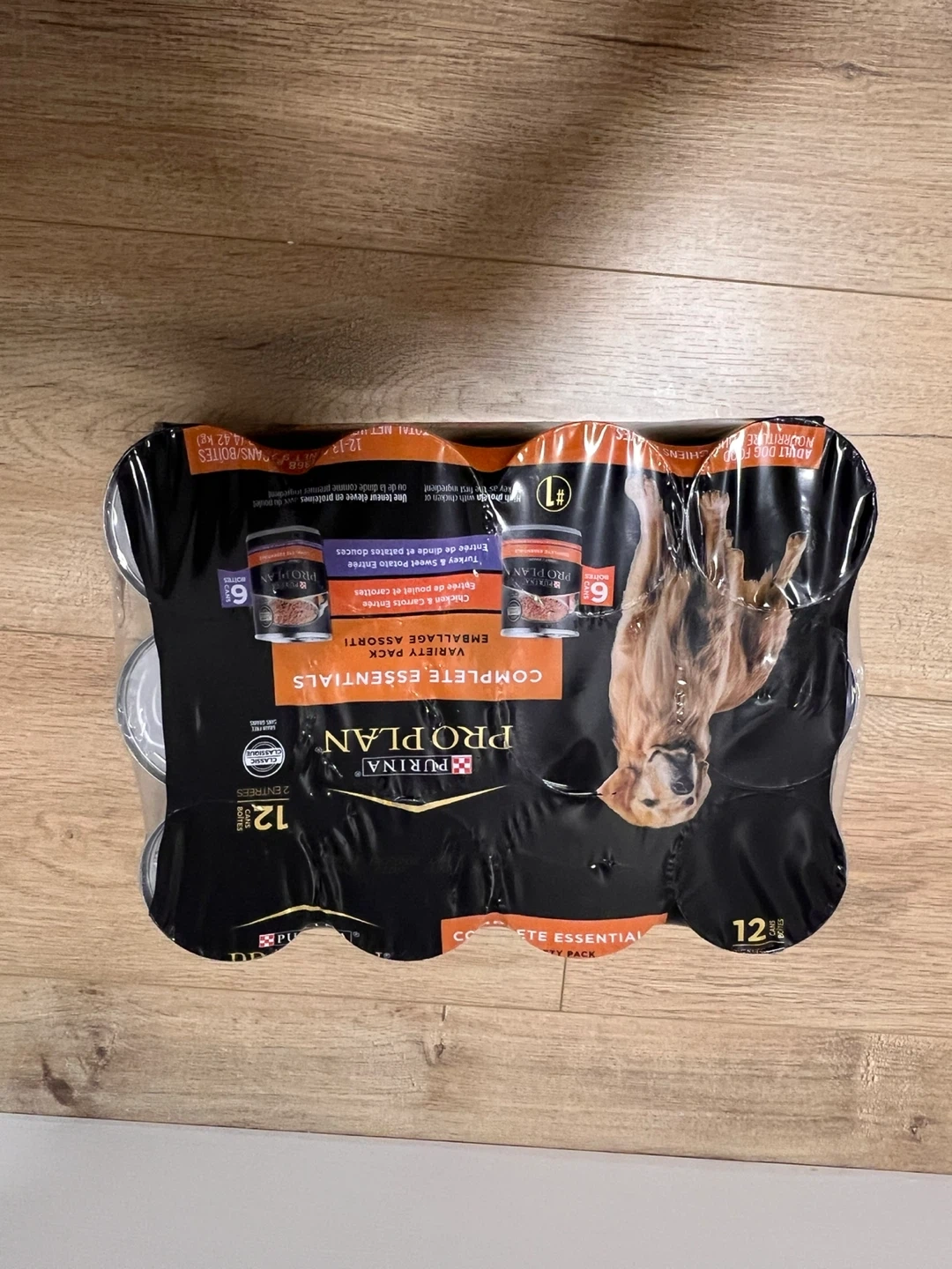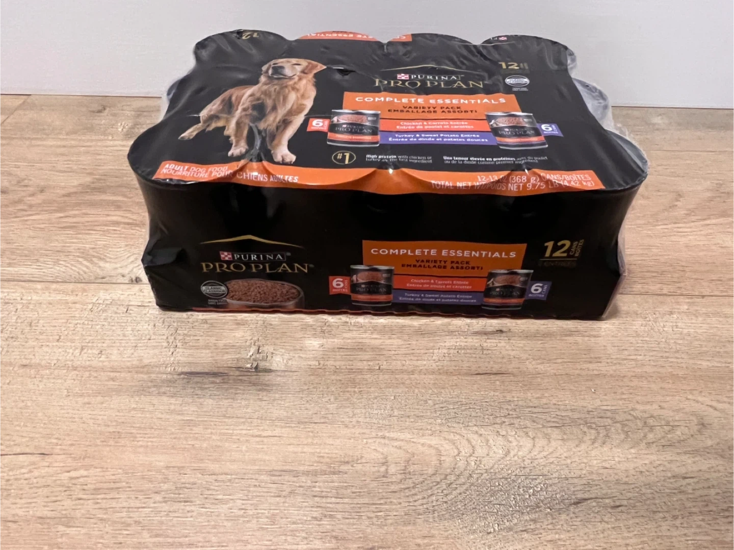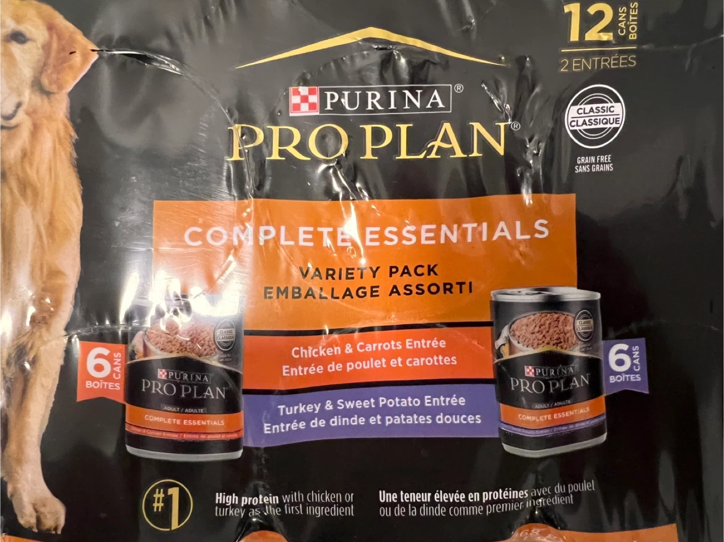Purina Pro Plan Complete Essentials Variety Pack for adult dogs. It's grain-free and features high protein with chicken or turkey as the first ingredient.