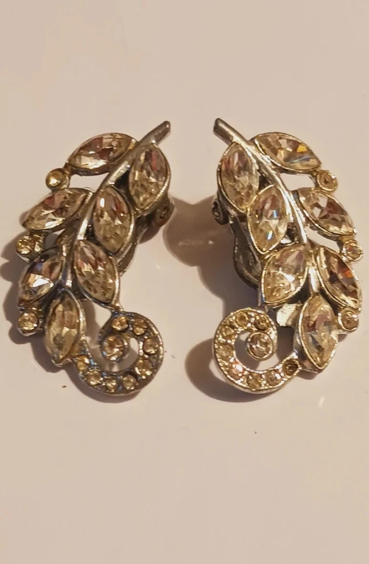 Art Deco Charming Vintage Sparkling ✨️ rhinestone earrings designed like detailed leaves with a swirl accent. These are clip-on style earrings. Excellent condition. 1.5"×1". ALL MY PRICES ARE NEGOTIABLE !!
