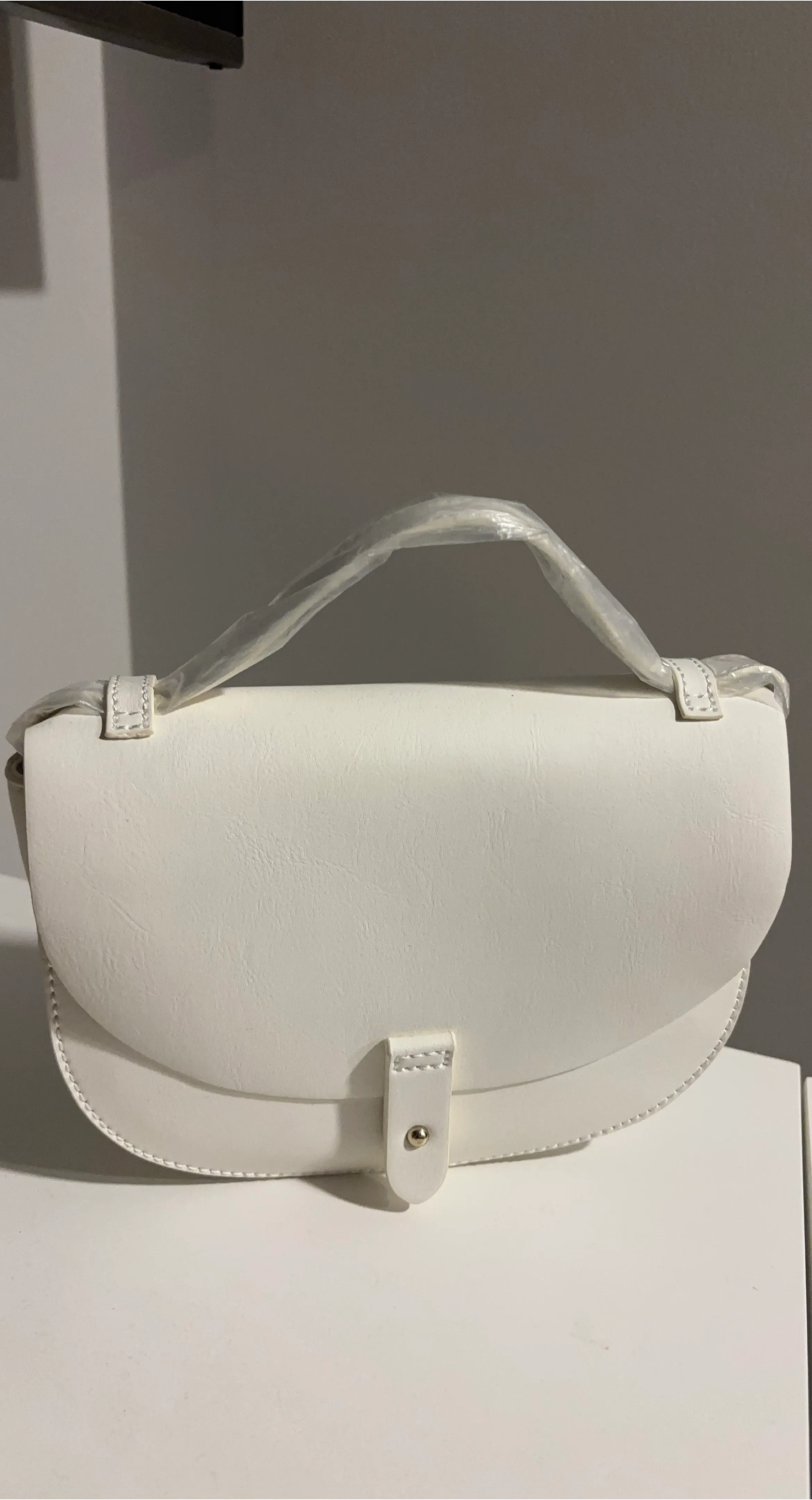 This is a clean white saddle bag purse. It features a classic flap closure and a single top handle. The material appears to be faux leather.
