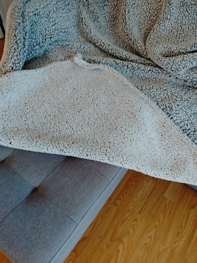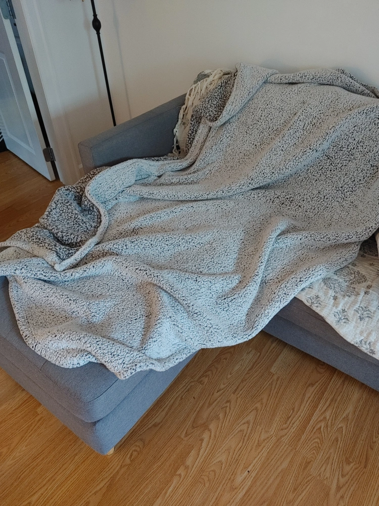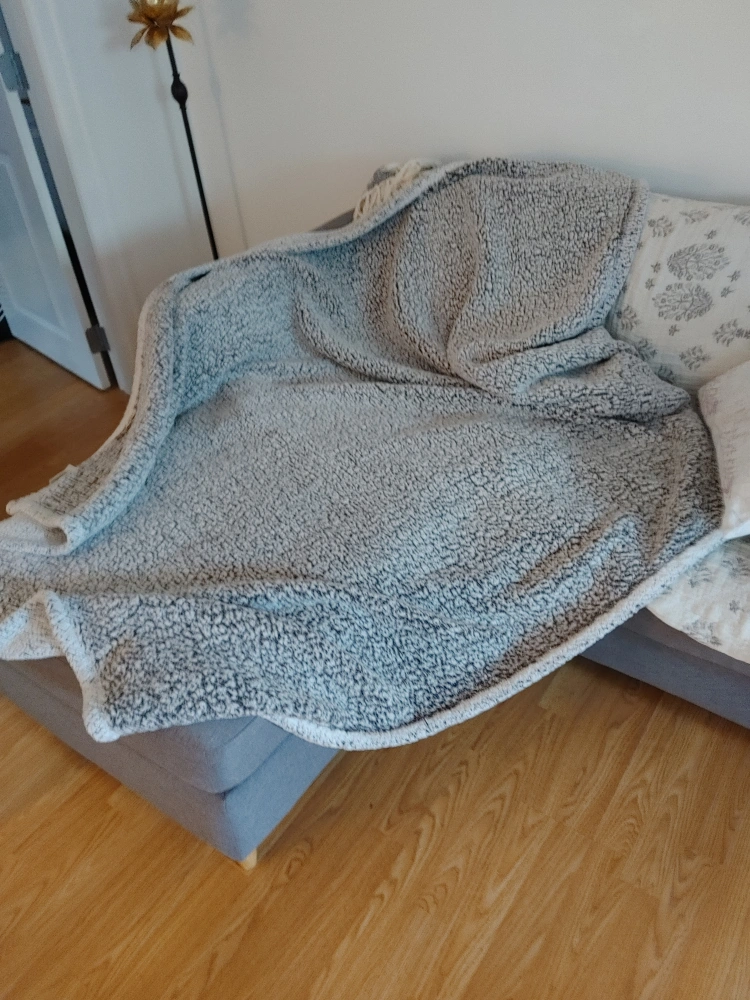 Super soft and cozy grey Sherpa fleece throw blanket. It's perfect for snuggling up on the couch during chilly evenings. The material is thick and warm, great for added comfort.
