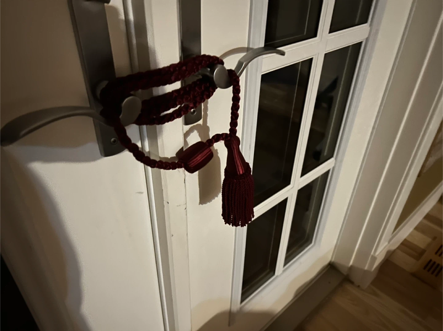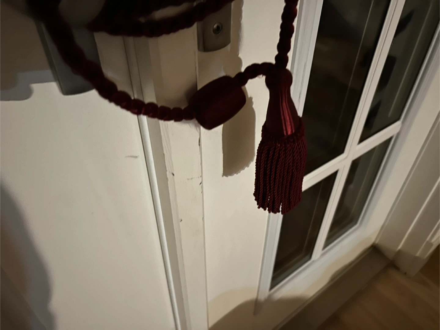 Decorative tassel rope in a deep red colour. It's braided and finished with a large, fringed tassel and a smaller decorative element. Adds a touch of elegance!