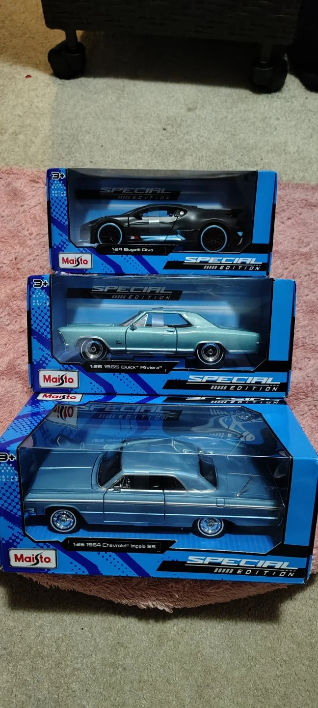 Together or separate Includes a black 2020 Bugatti Divo, a light blue 1965 Buick Riviera, and a blue 1964 Chevrolet Impala SS. All are in their original packaging boxes never opened . These are great for older children for to collectors and car enthusiasts!