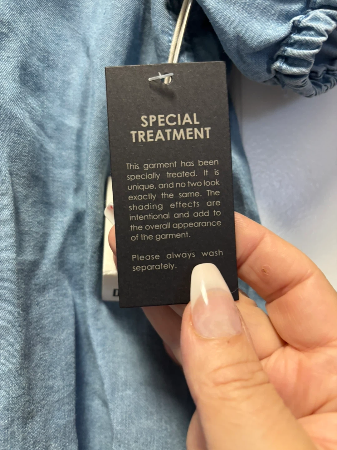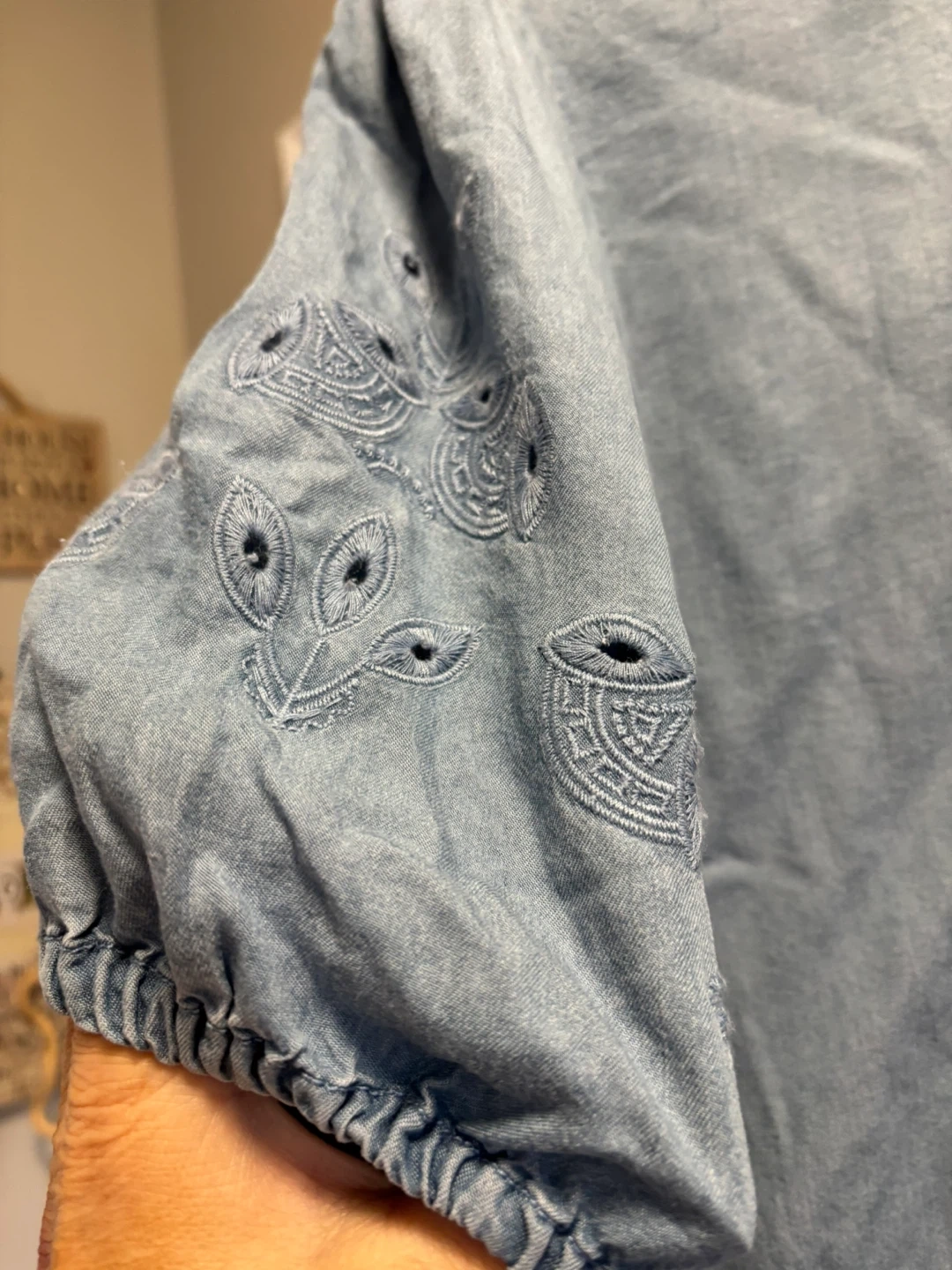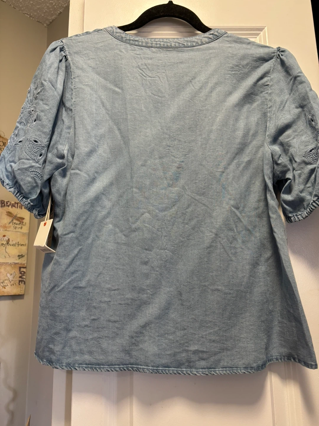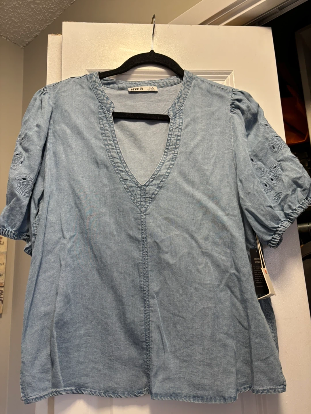 This light wash denim top is made from 100% Tencel. It's a size medium with short, puffed sleeves and decorative embroidery. The garment has a special treatment for a unique look.