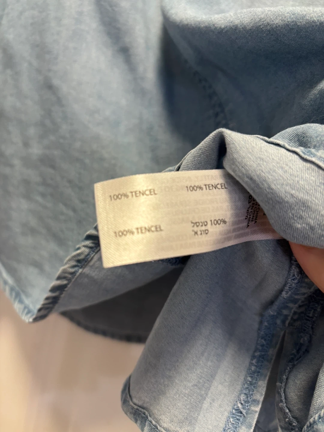 This light wash denim top is made from 100% Tencel. It's a size medium with short, puffed sleeves and decorative embroidery. The garment has a special treatment for a unique look.