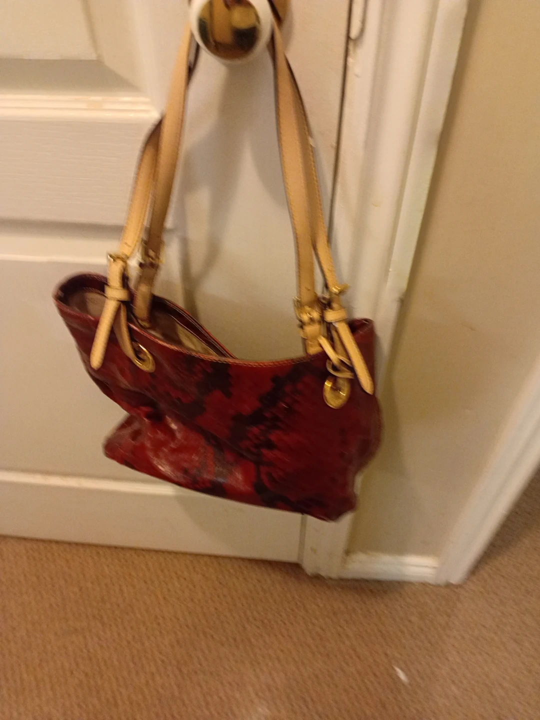 This is a stylish red tote bag with a unique black pattern. It features adjustable tan leather straps and gold-tone hardware. The bag's interior is spacious.
