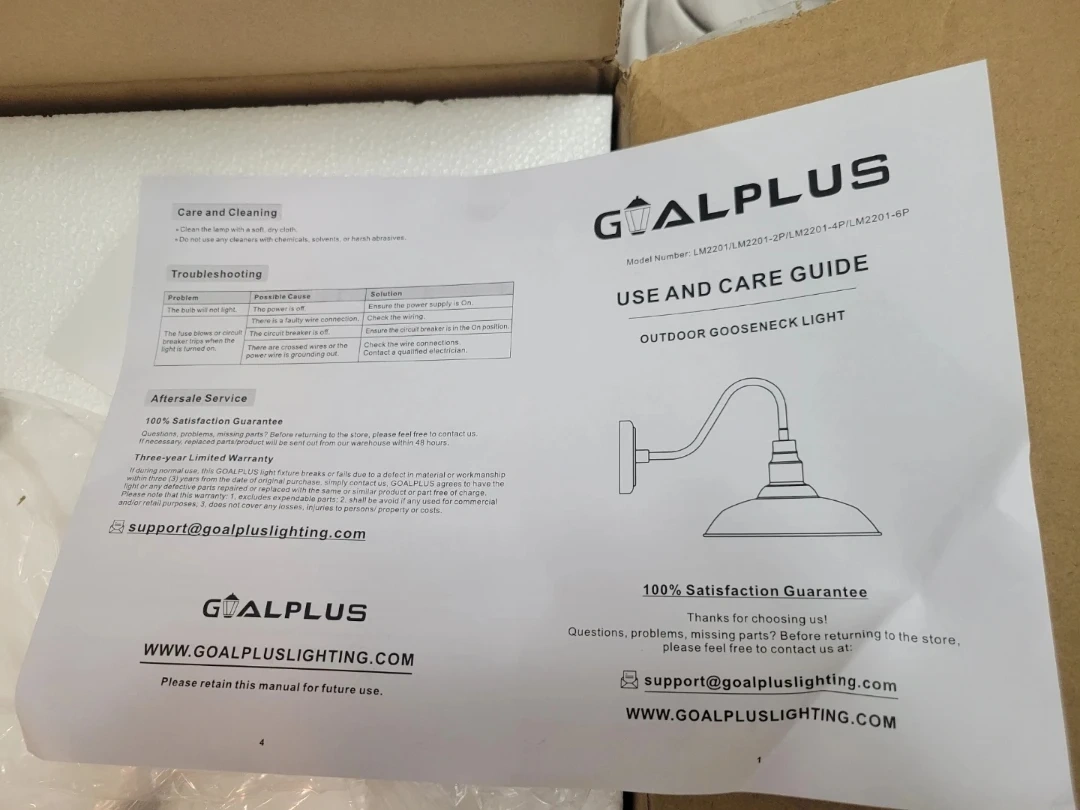 This is a GOALPLUS outdoor gooseneck light. It comes with a care and cleaning guide. Includes a three-year limited warranty for peace of mind. This light would be useful for illuminating exterior doorways or pathways.