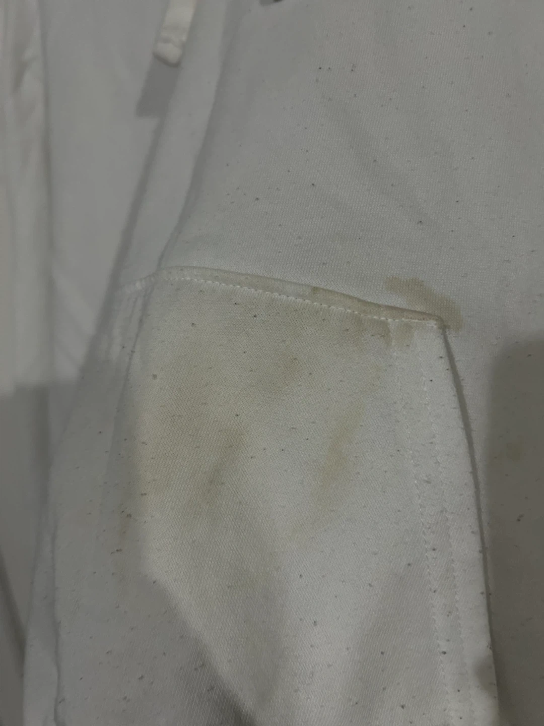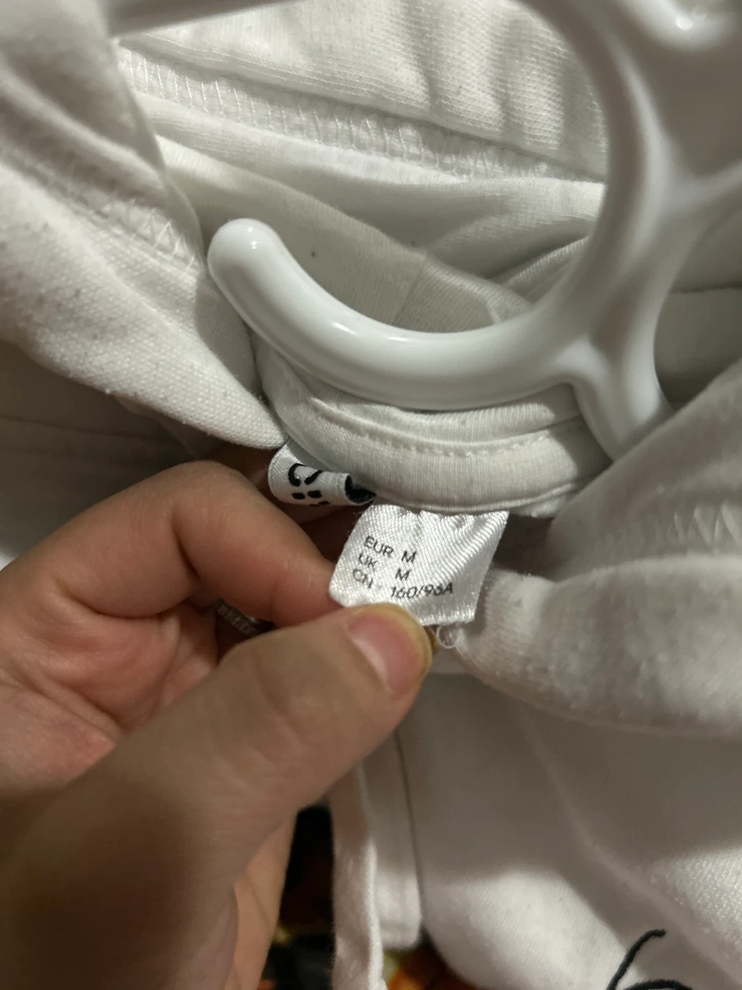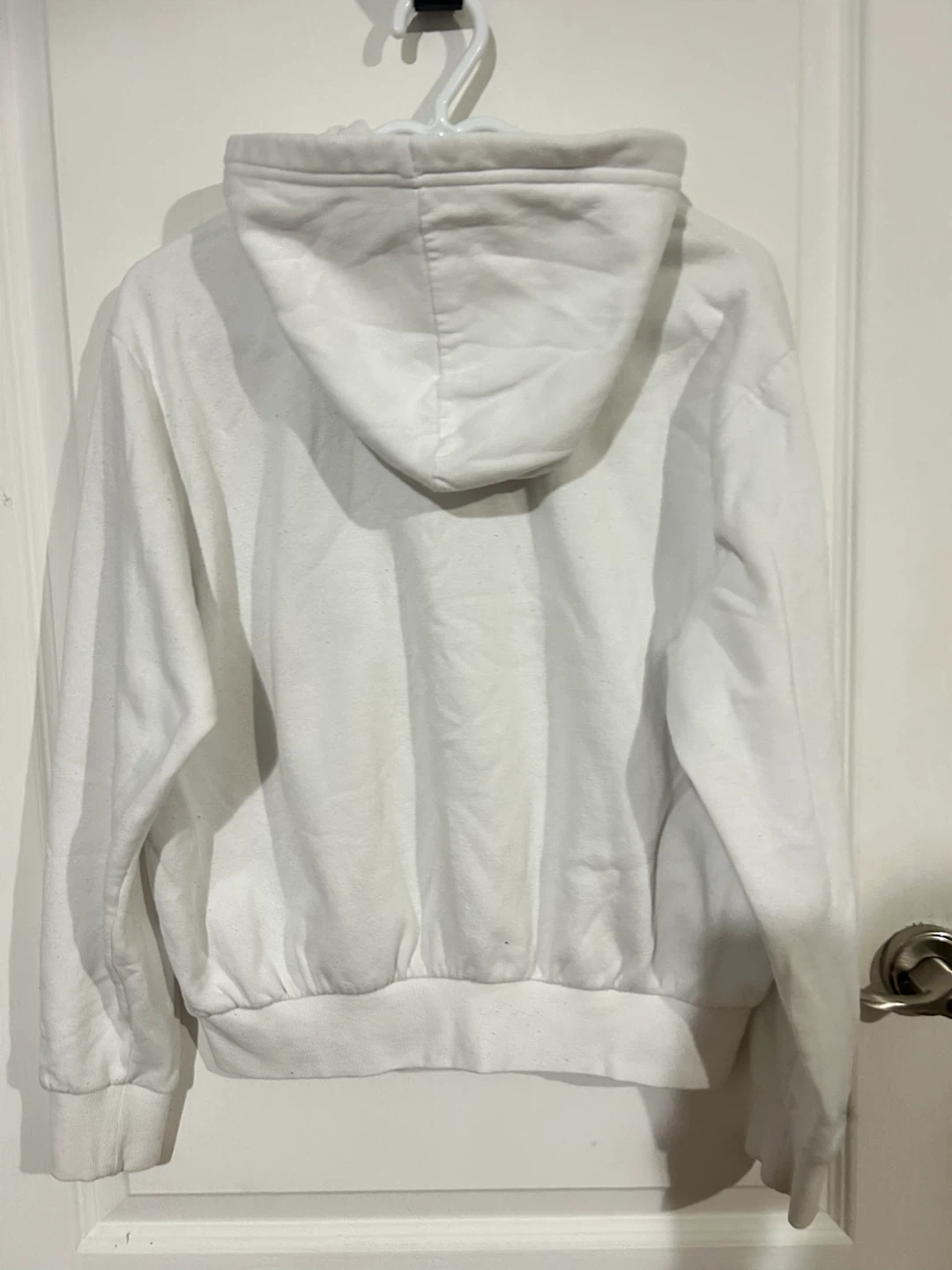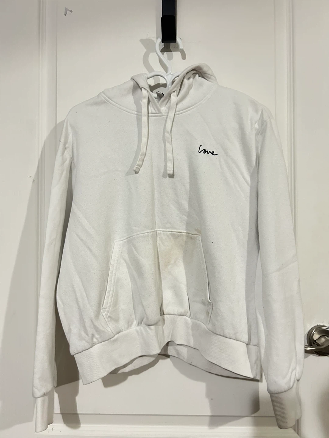 This is a white H&M hoodie with a small 'love' graphic on the chest. It's a size medium and has a front pouch pocket. There are some faint yellow stains on the front pocket area.