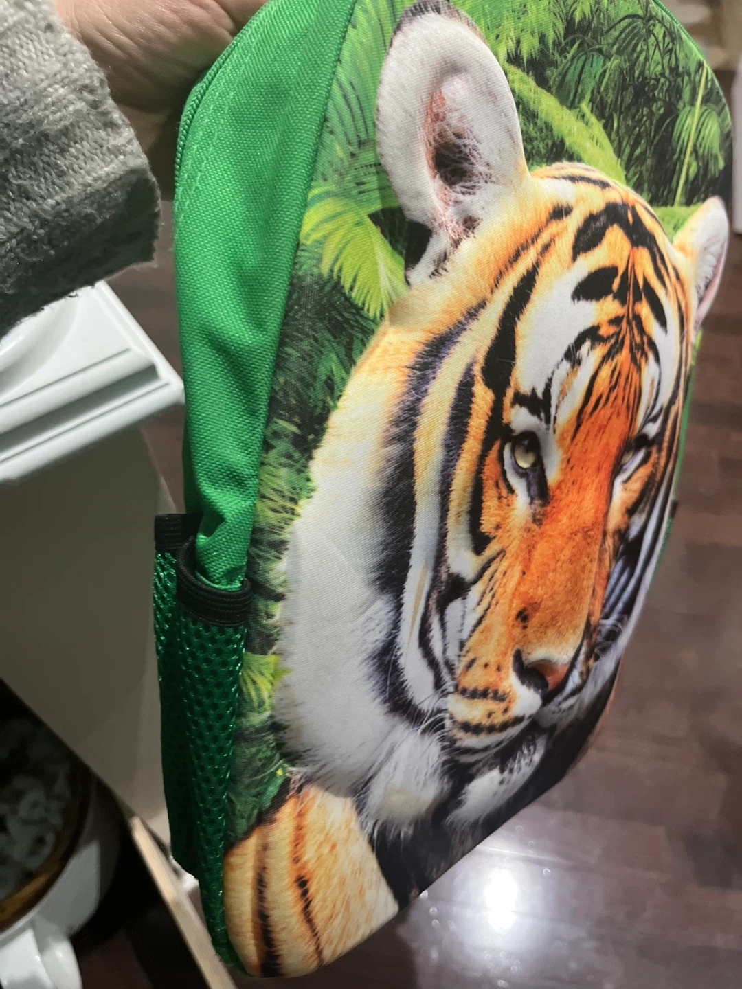 This is a fun kids' backpack featuring a vibrant tiger face design. It has a main zippered compartment and a side mesh pocket. It's perfect for little ones heading to school or daycare!