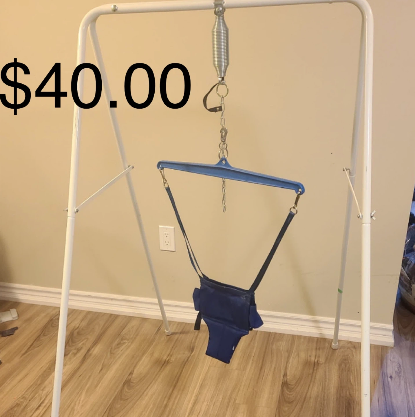 White metal stand with a blue fabric jumper seat. It suspends a baby for playtime. It's in good condition and ready for a new home!