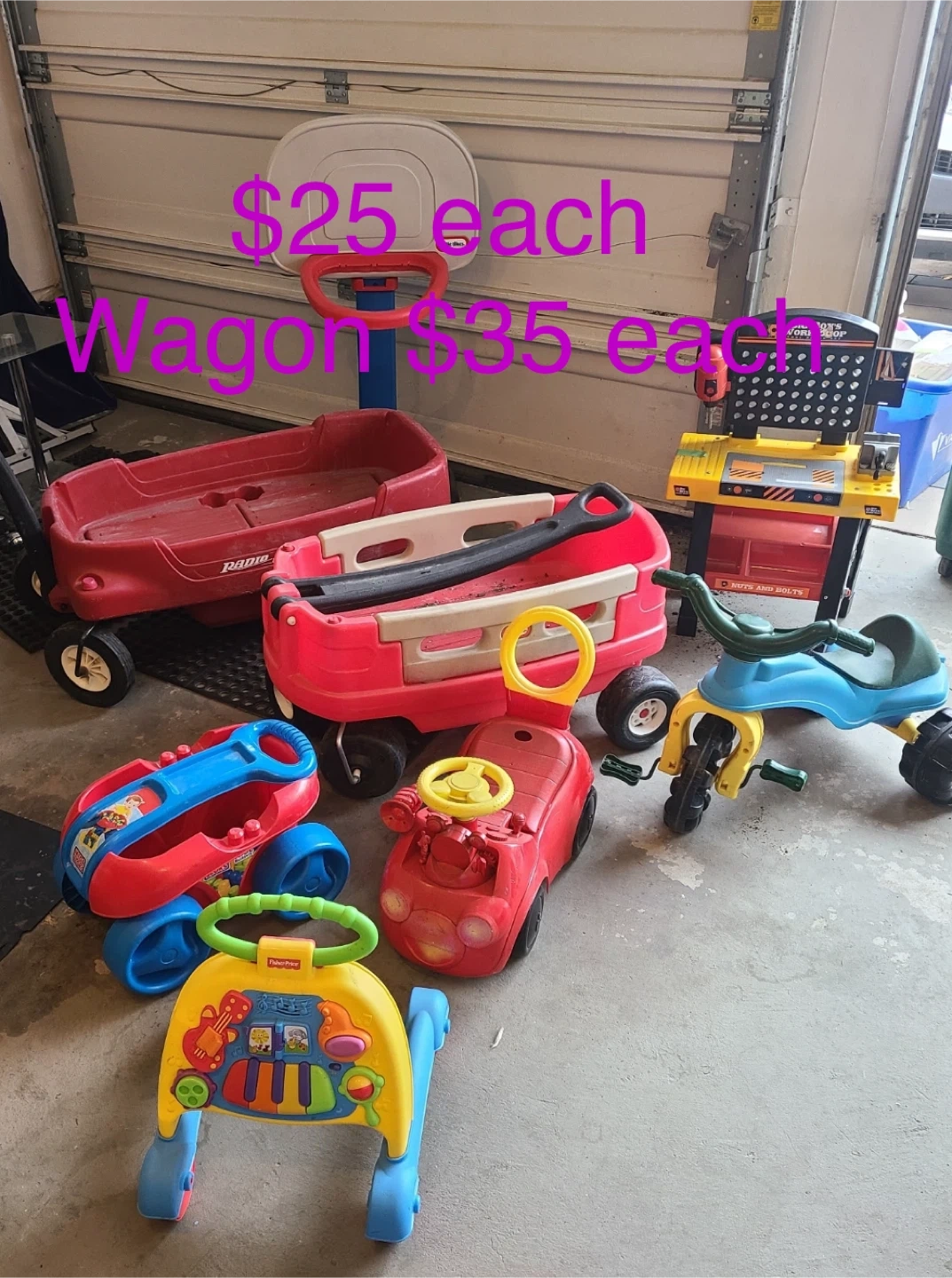 A red Radio Flyer wagon is available for $35. Other assorted kids' toys, including a red car, a blue and yellow trike, and a Fisher-Price activity walker, are $25 each. These toys are suitable for outdoor play.