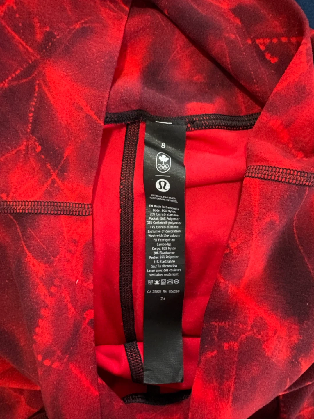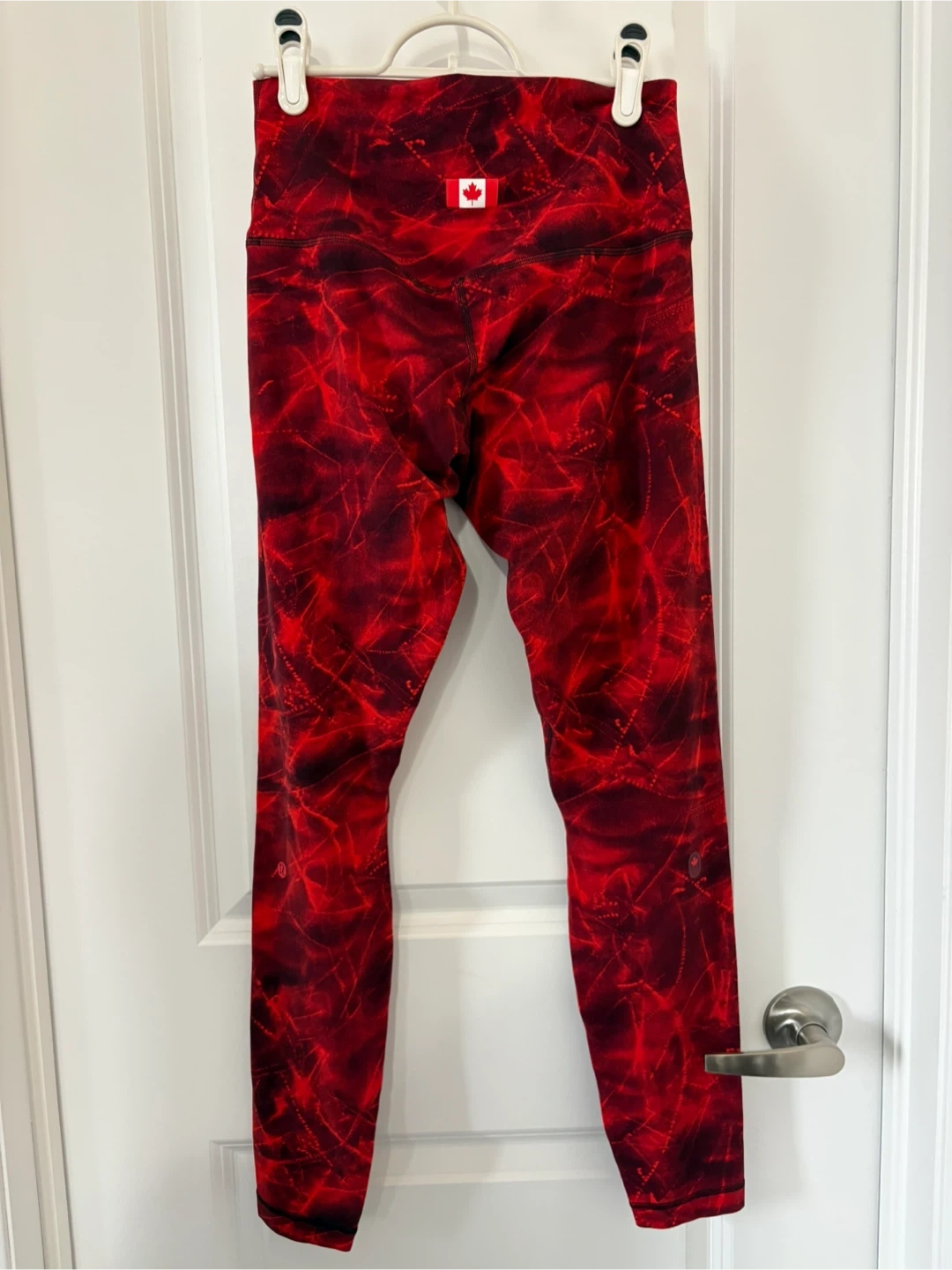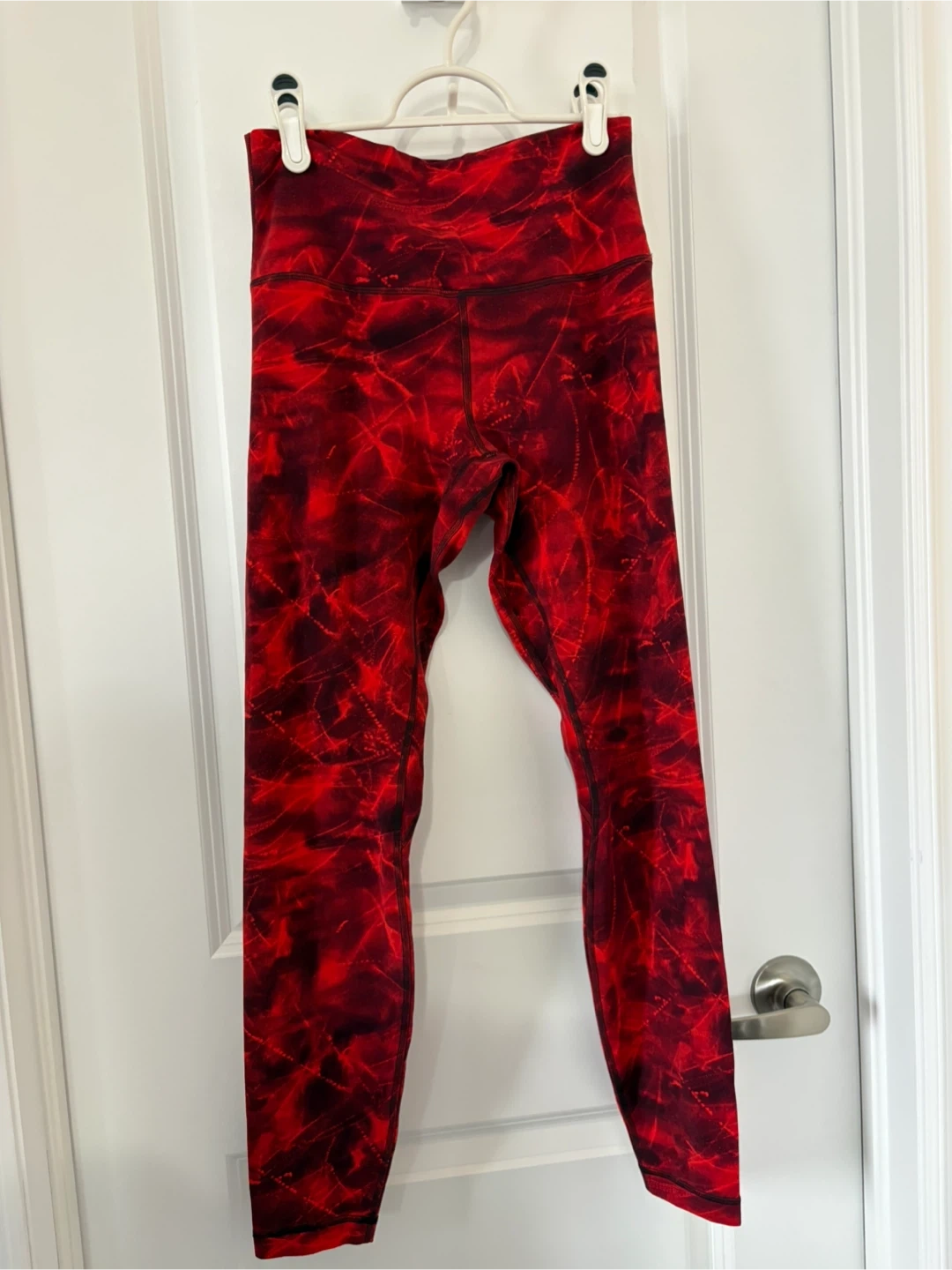 These Lululemon Align HR pants are a size 8 and feature a vibrant red abstract design. Great for workouts or everyday wear!