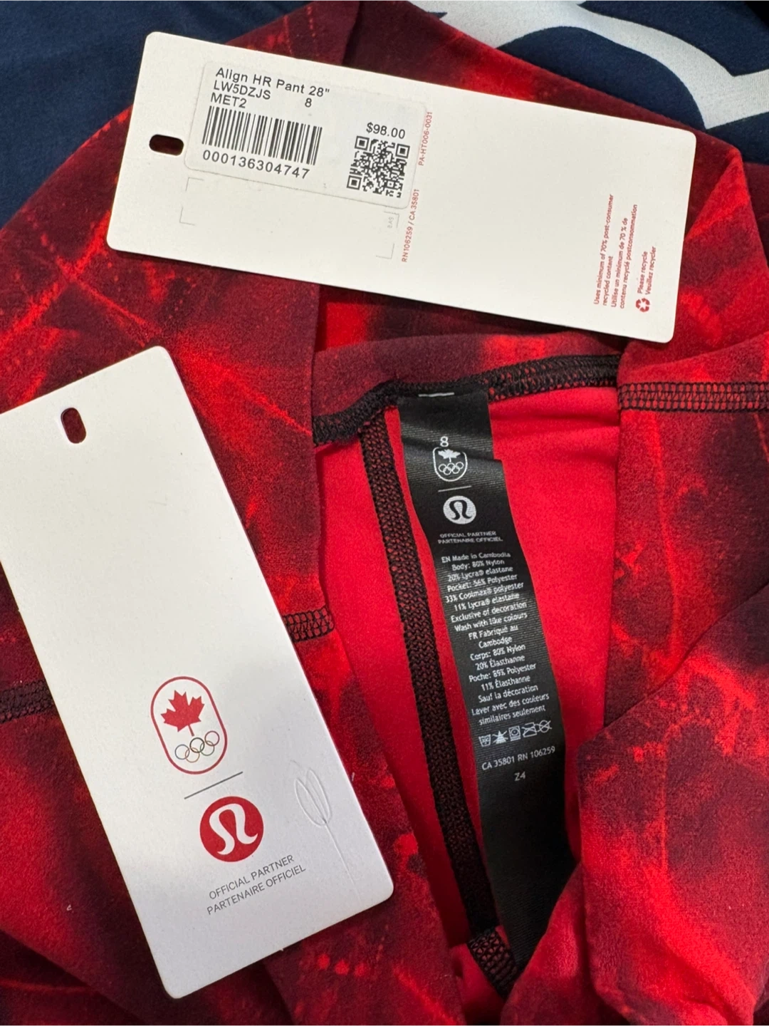 These Lululemon Align HR pants are a size 8 and feature a vibrant red abstract design. Great for workouts or everyday wear!
