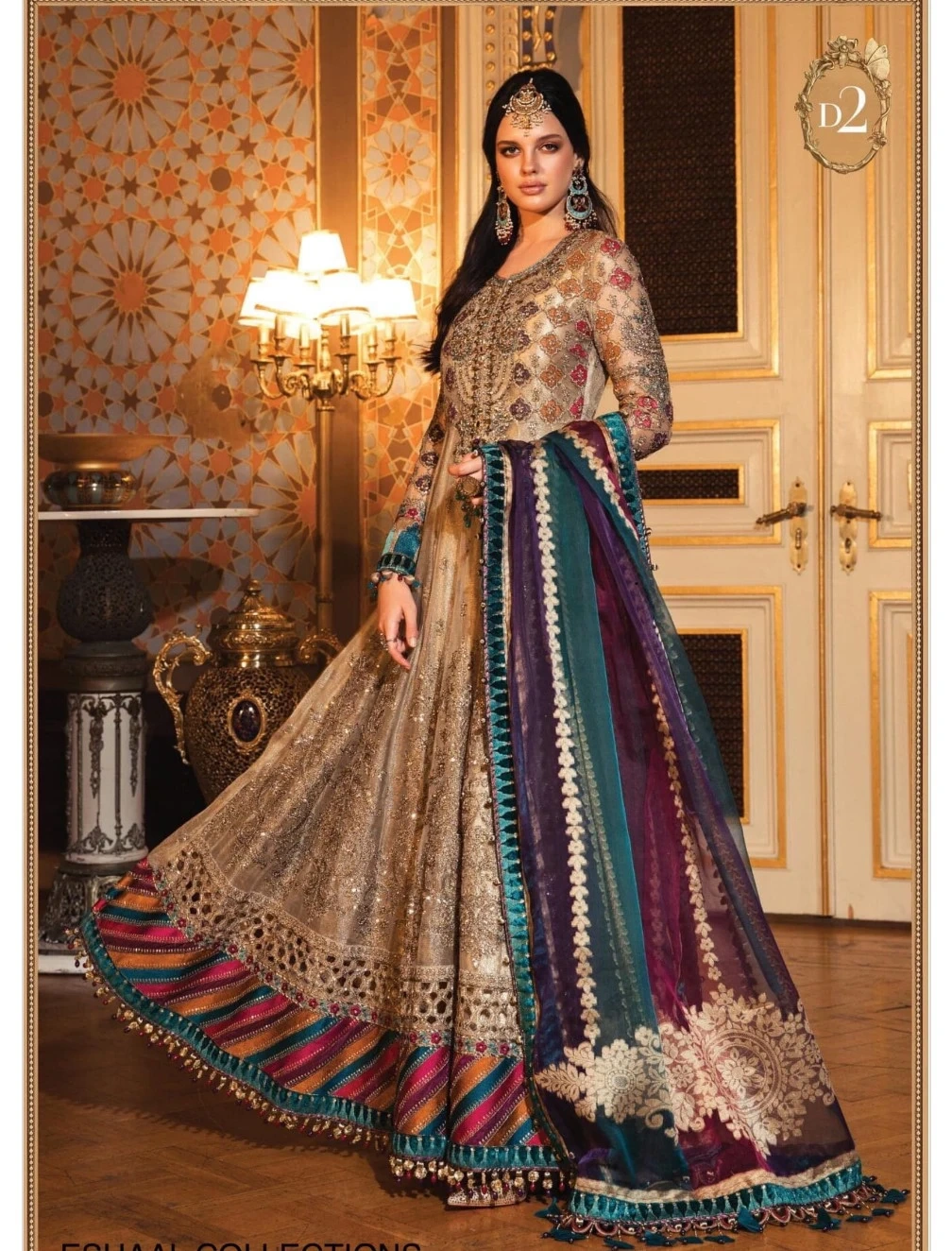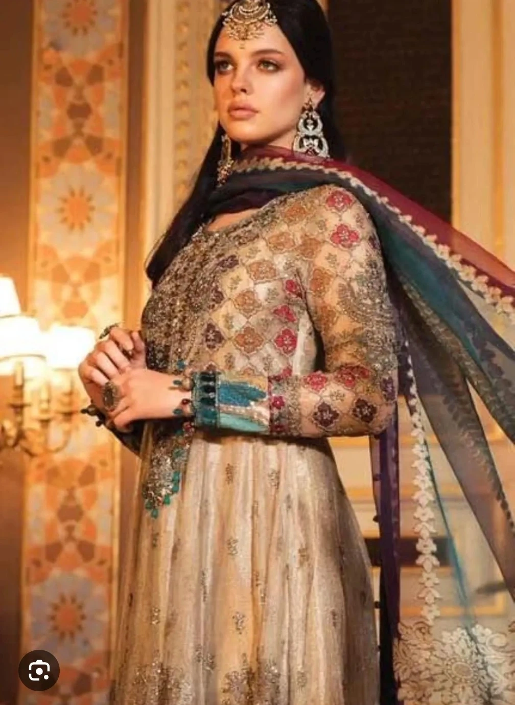 This stunning gold and multi-coloured Anarkali suit features intricate embroidery and beadwork. It comes with a matching dupatta. Perfect for formal events and celebrations!